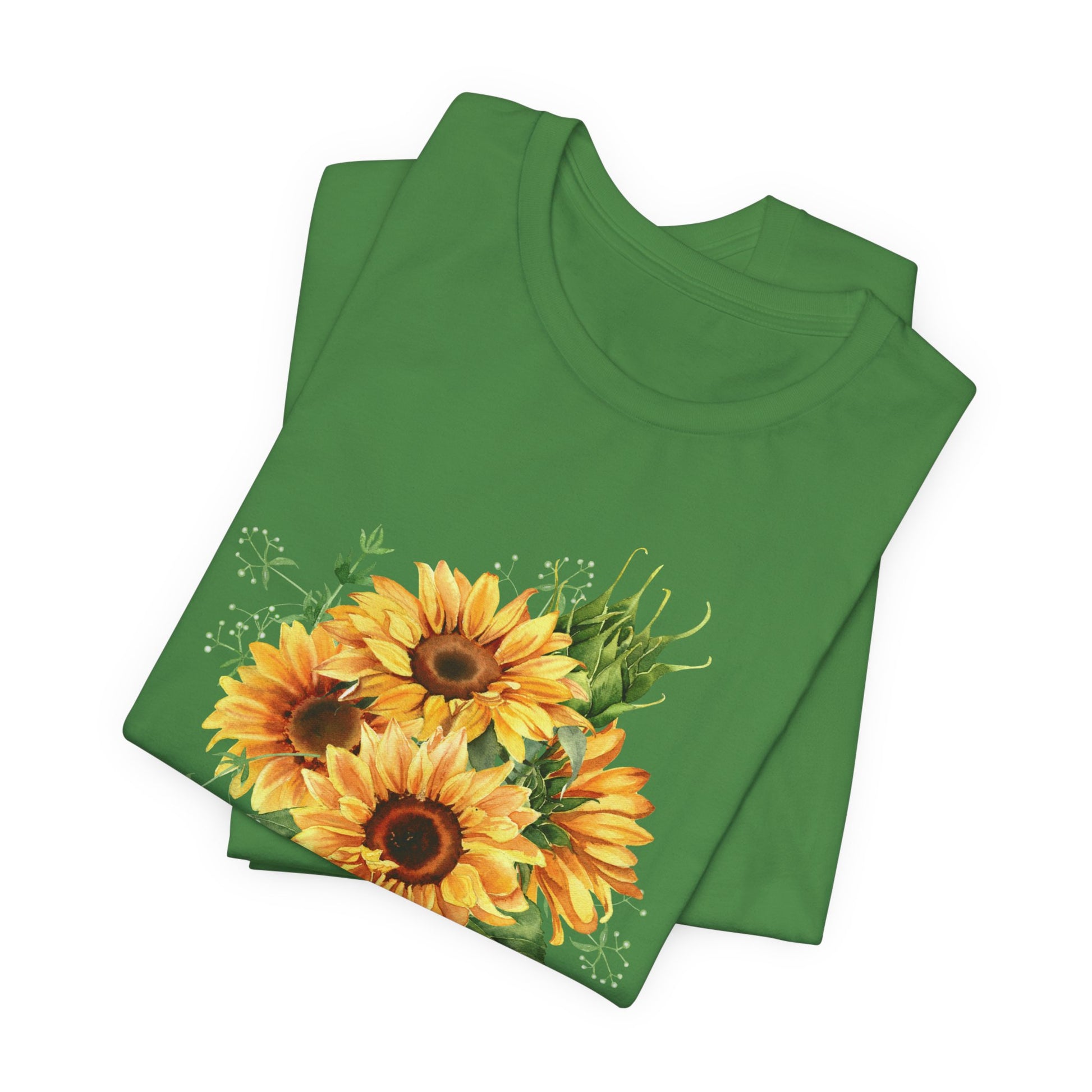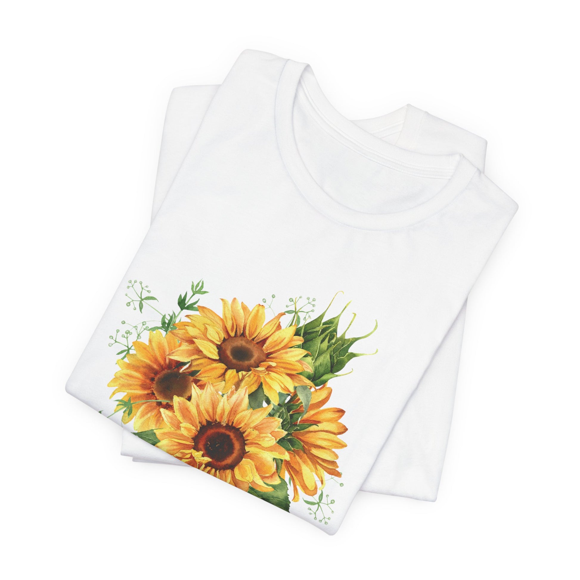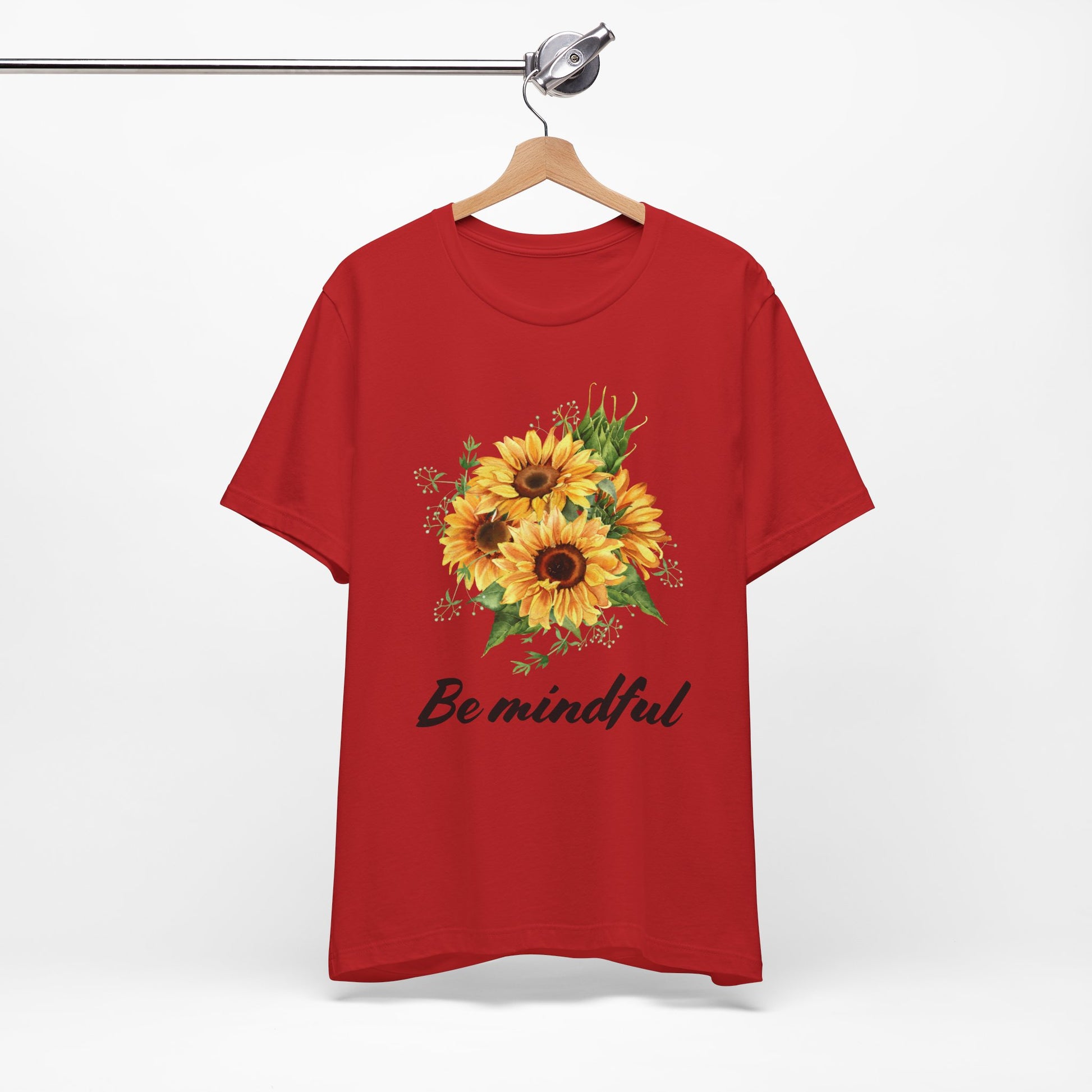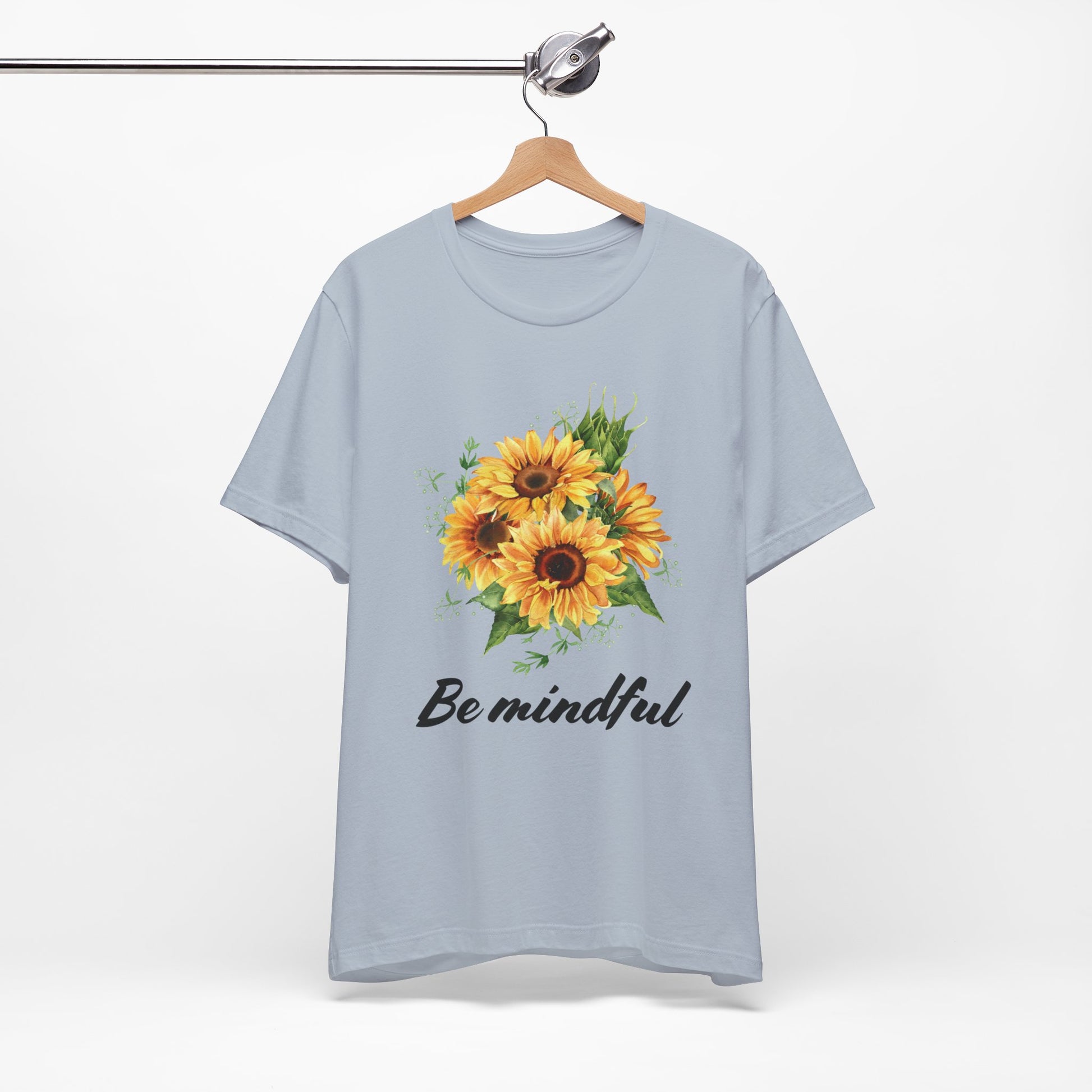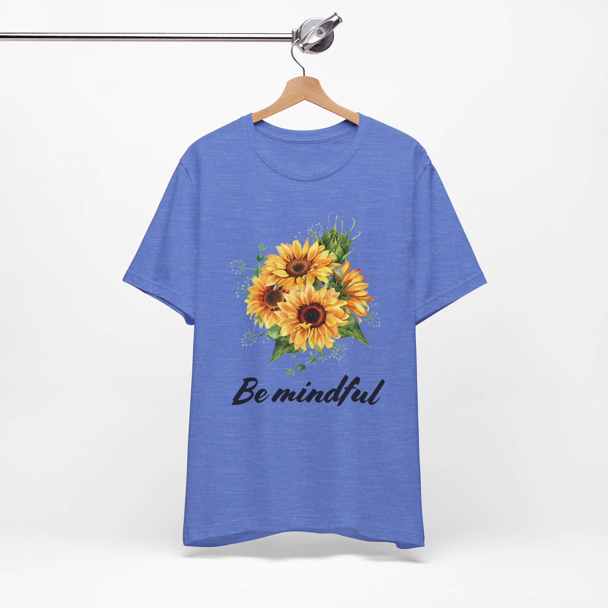 Find your peace with the "Be Mindful" sunflower t-shirt. This beautiful design combines a stunning watercolor sunflower bouquet with a gentle reminder to stay present. Perfect for those who love nature and mindfulness.