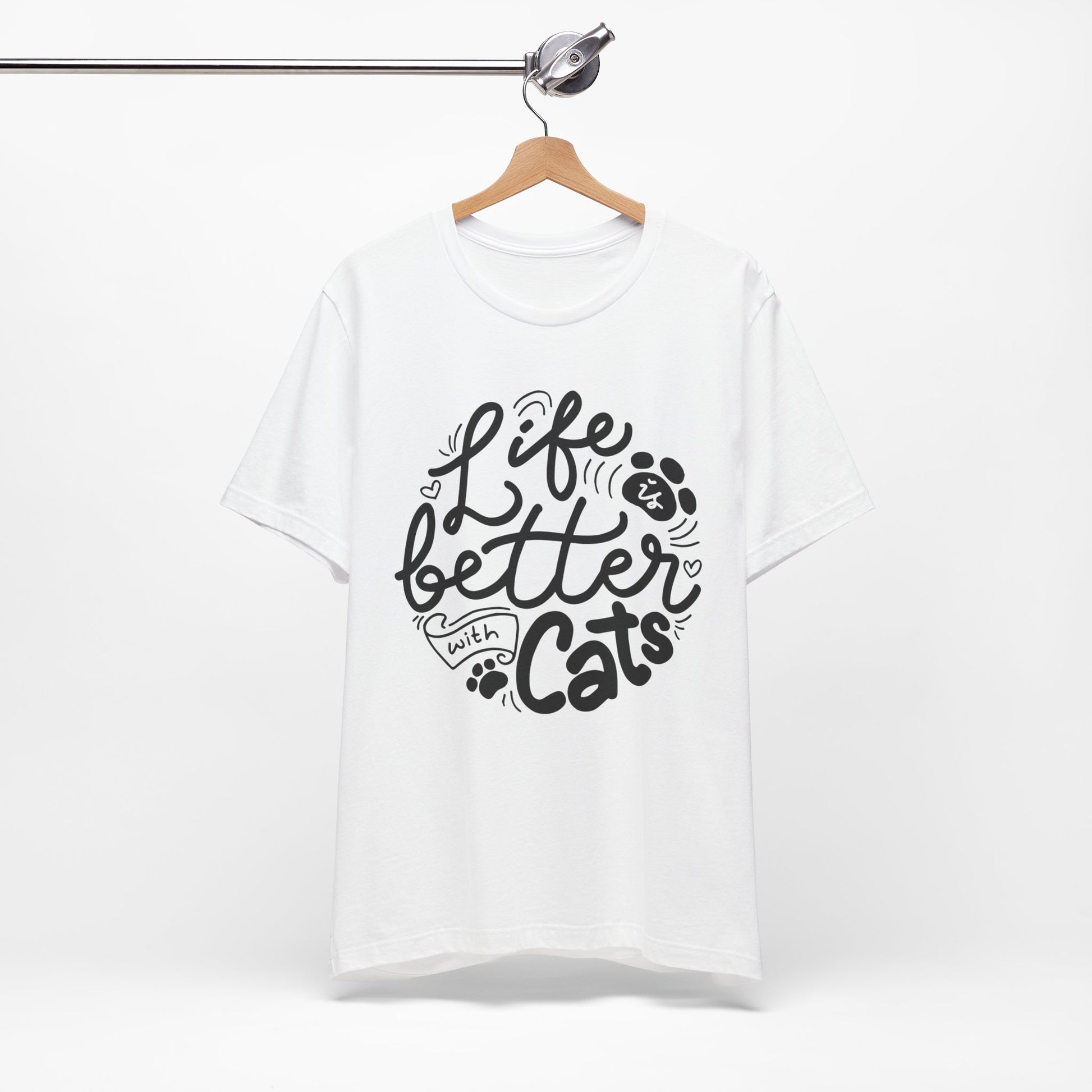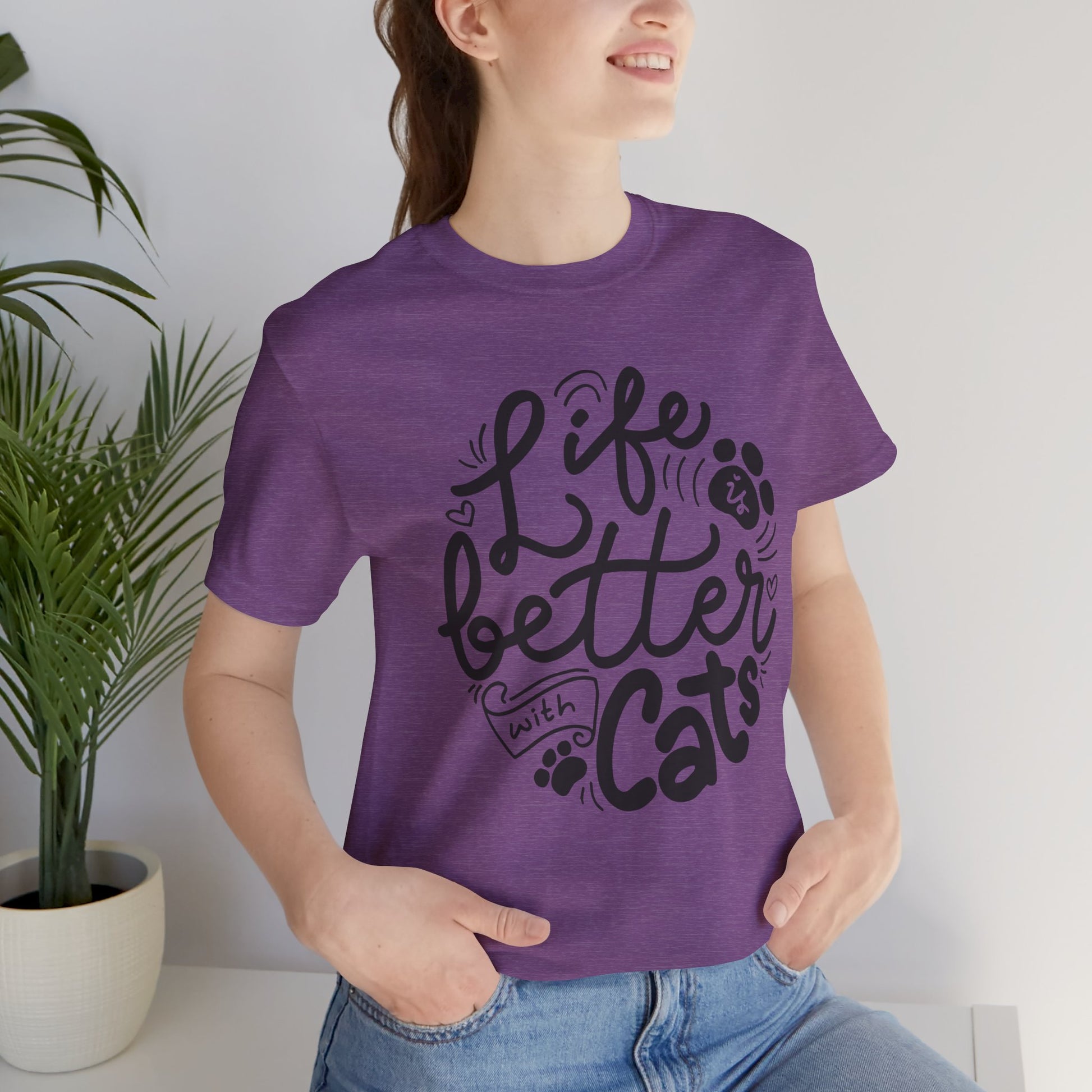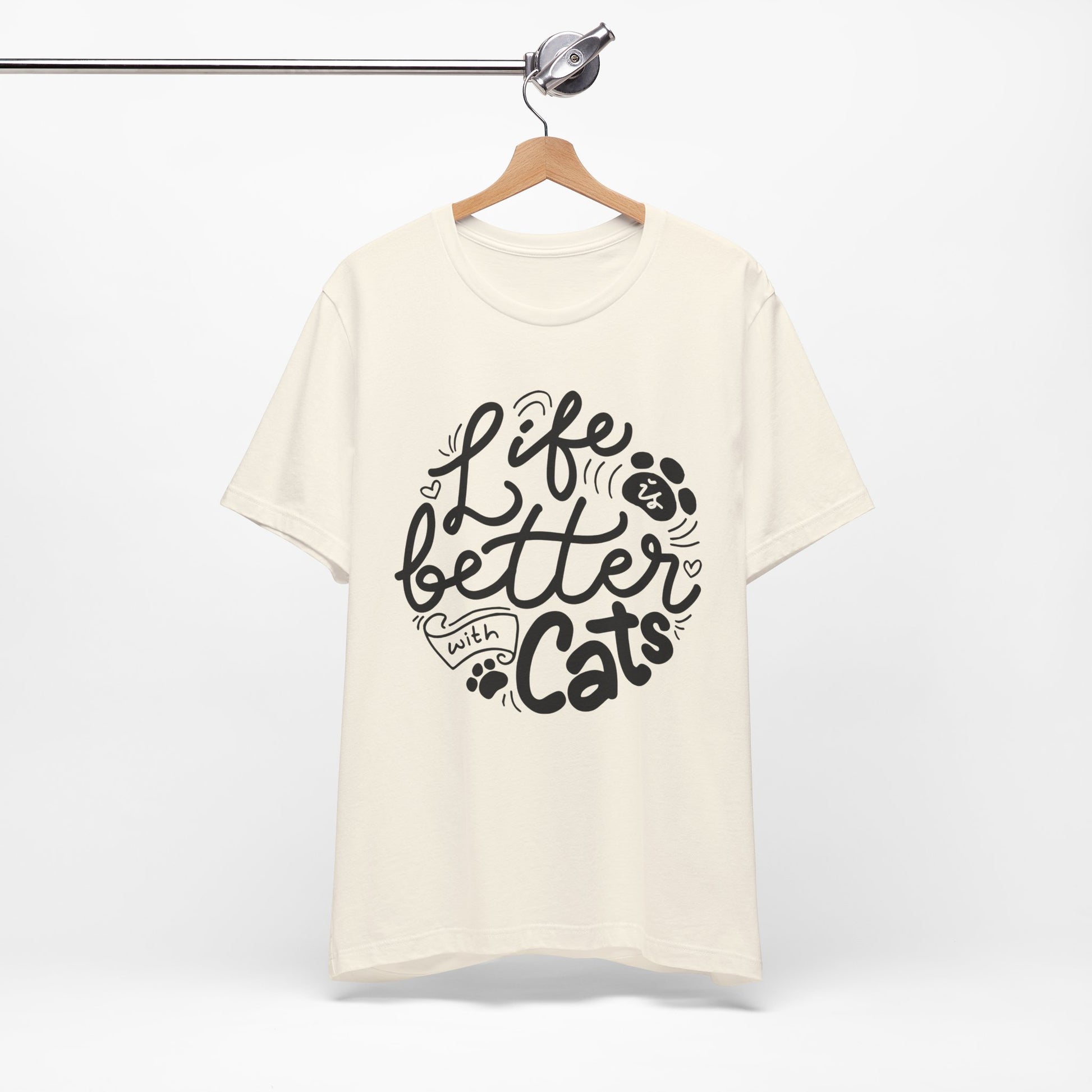 Experience the joy of feline companionship with this stylish unisex jersey short sleeve tee. Designed for both comfort and flair, this shirt boasts a classic cut that makes it ideal for casual outings or lounging at home. The playful design, featuring the phrase "Life is better with Cats," resonates with cat lovers of all ages, making it a perfect gift for birthdays, holidays, or just because. Lightweight and breathable, this tee is perfect for spring and summer wear, offering a versatile addition to any wardrobe. It easily transitions from relaxing at home to a casual day out, ensuring you feel great while showcasing your love for cats.