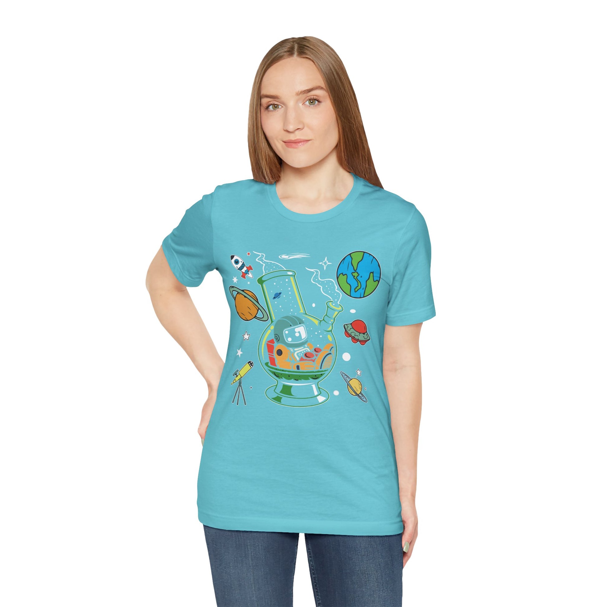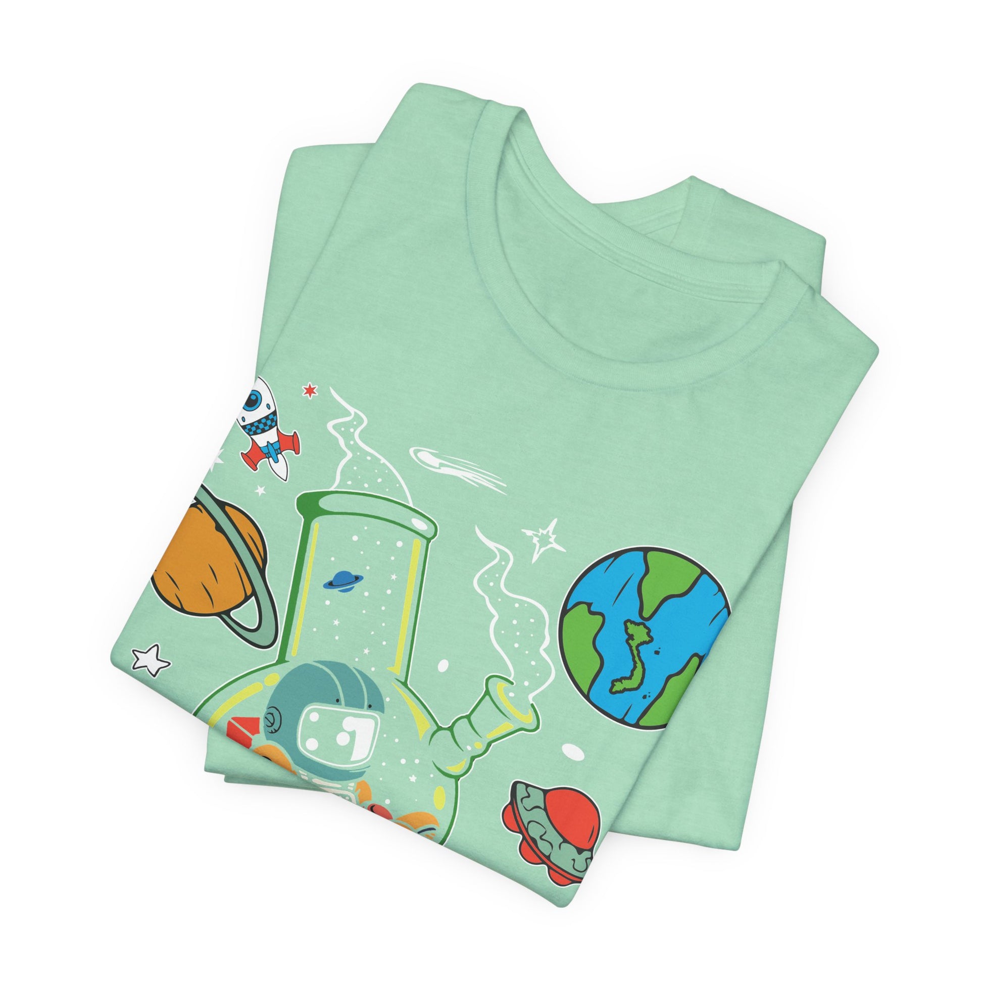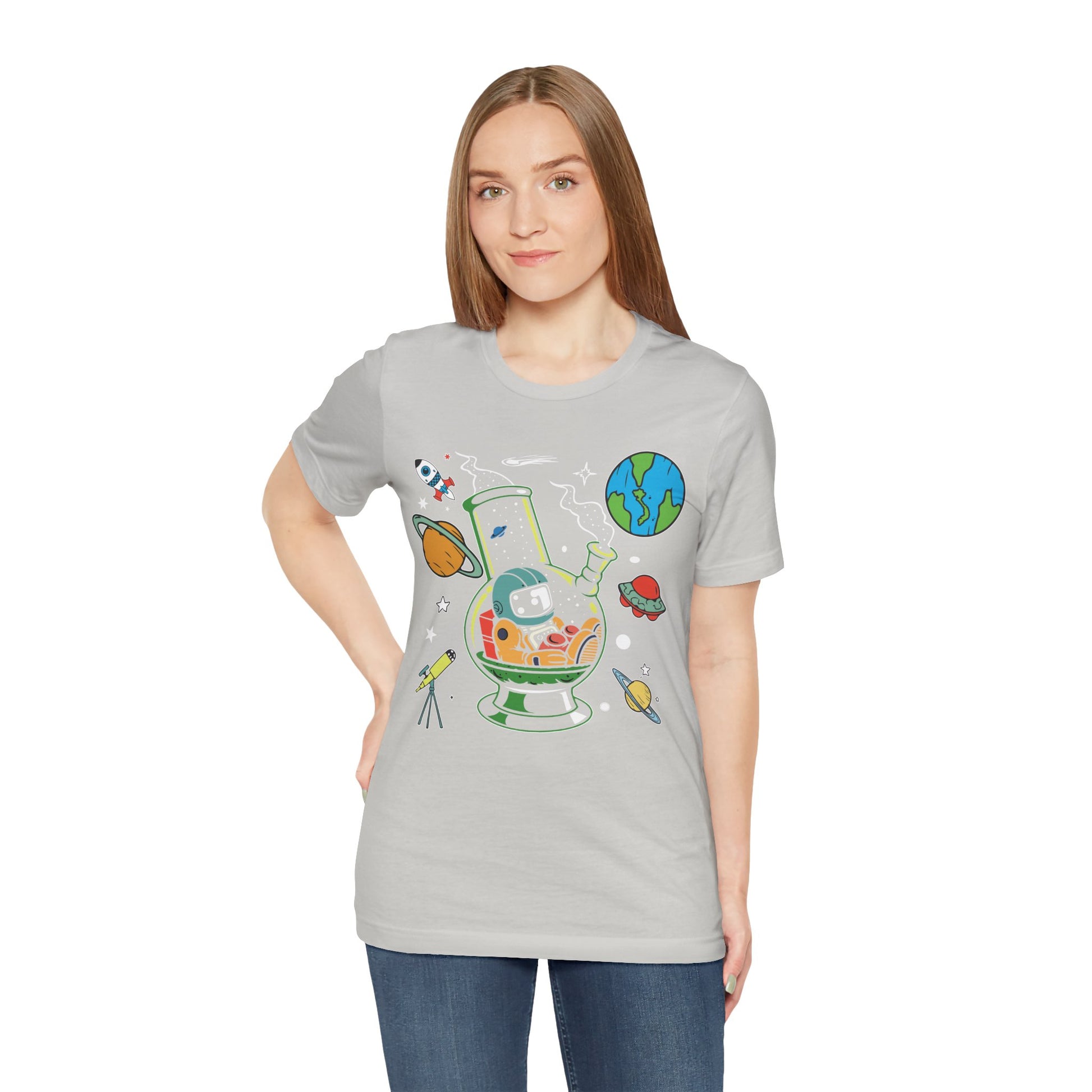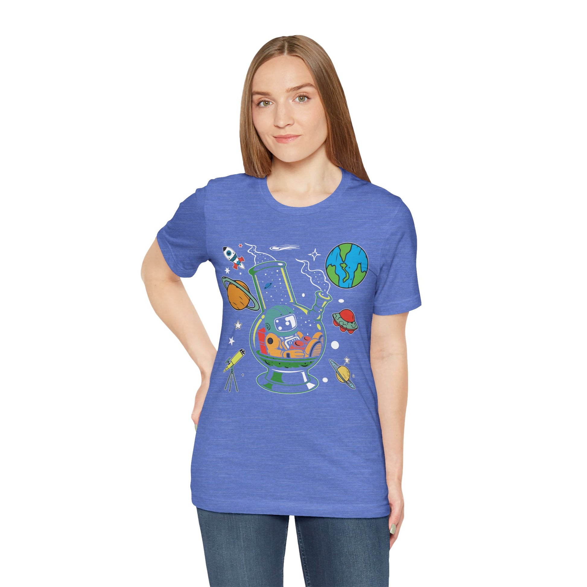 Get cosmically high with this unique graphic tee featuring an astronaut chilling inside a space-themed bong, surrounded by planets, rockets, and UFOs. A humorous and artistic design for those with a laid-back, out-of-this-world sense of humor.