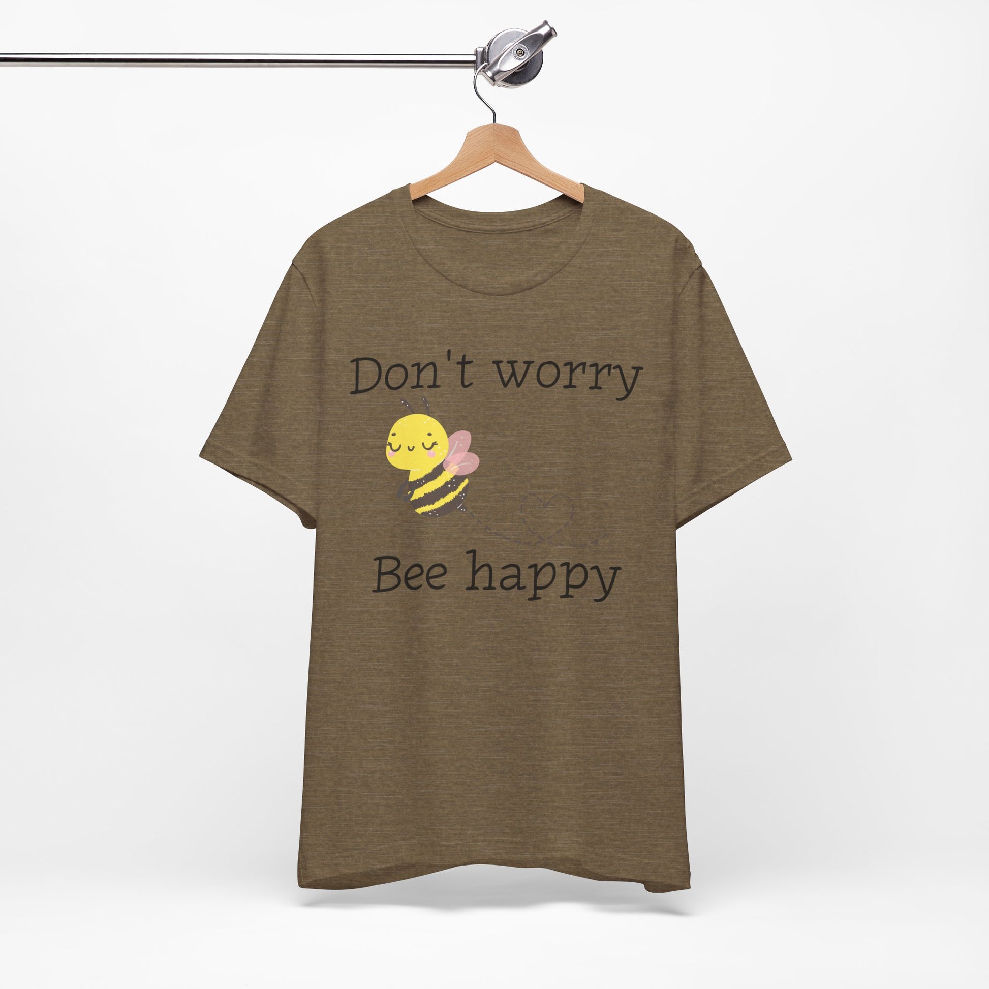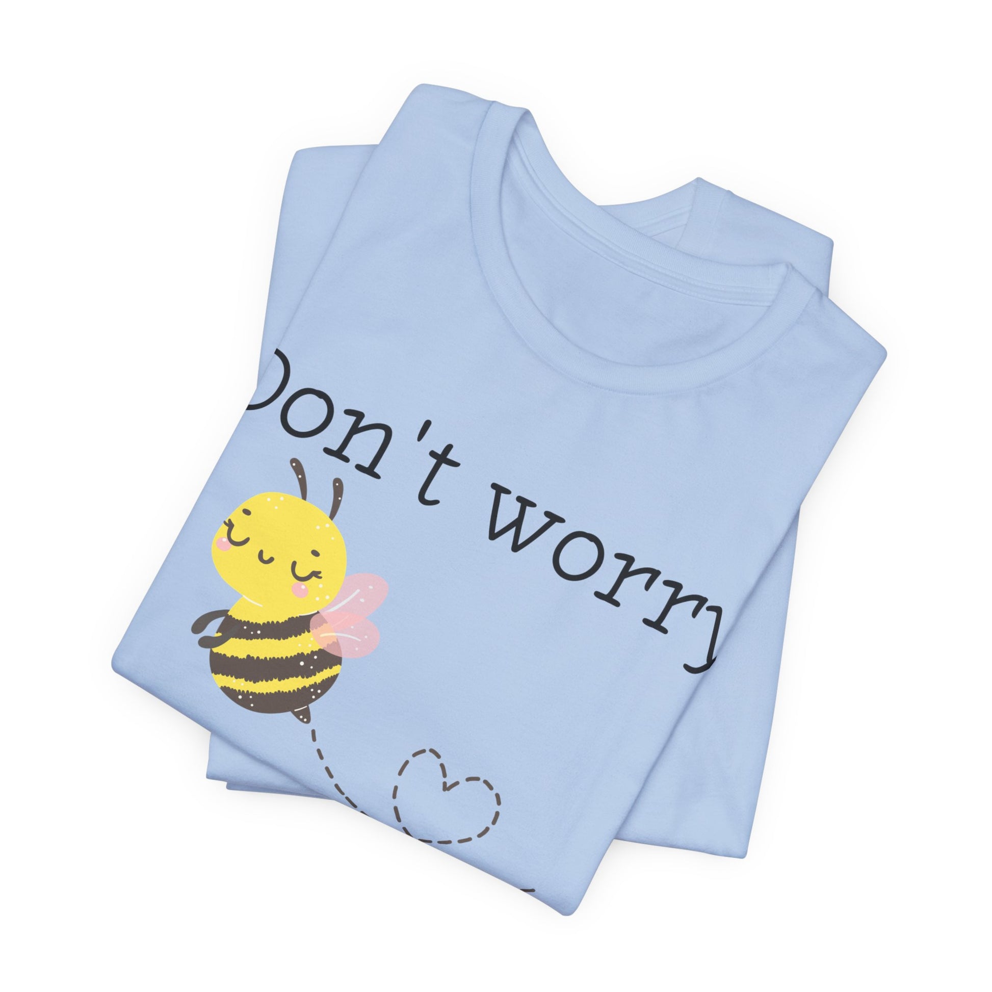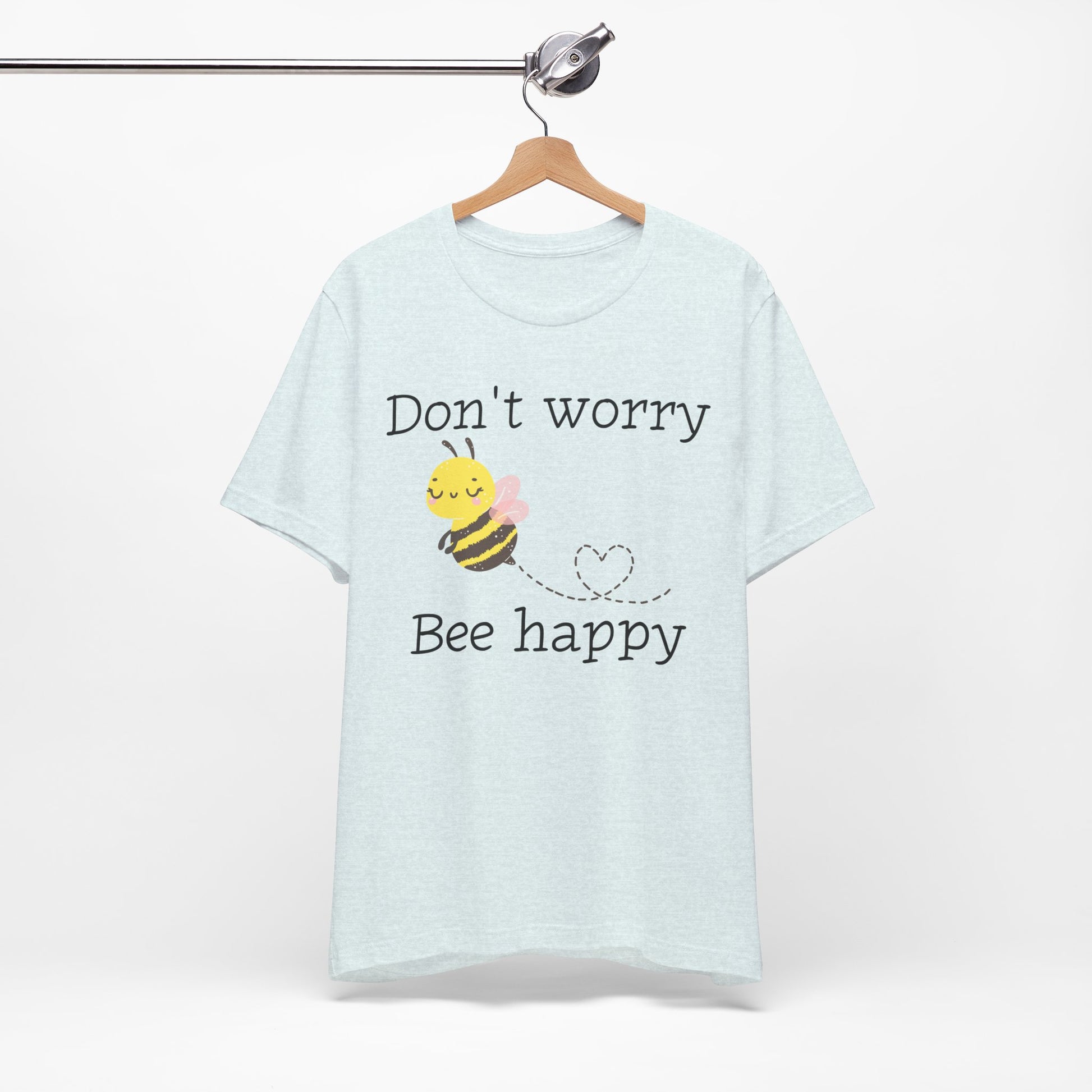 Stay cheerful with our "Don't Worry, Bee Happy" t-shirt, featuring an adorable bee graphic. This punny and positive tee is perfect for bee lovers or anyone who needs a little reminder to stay happy.