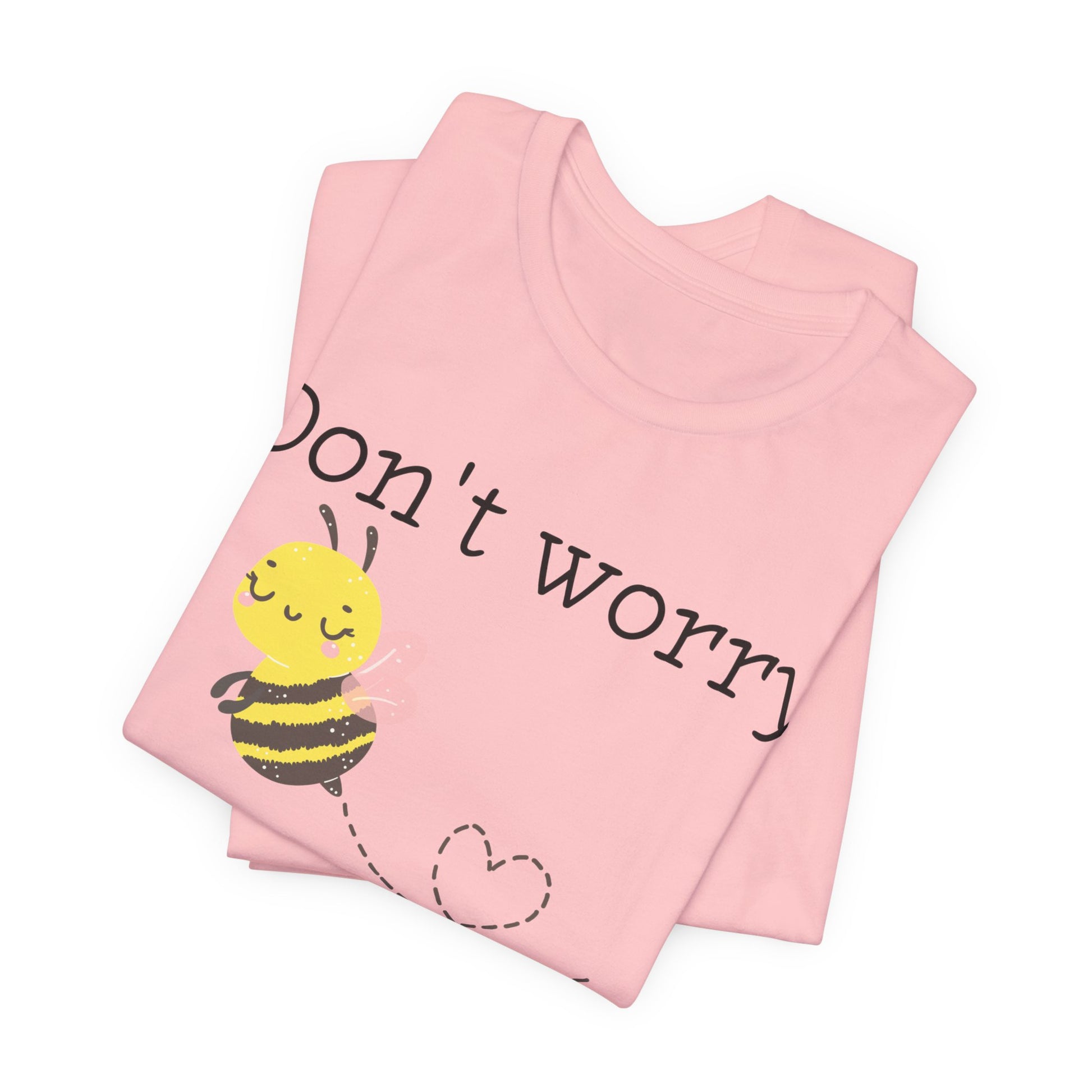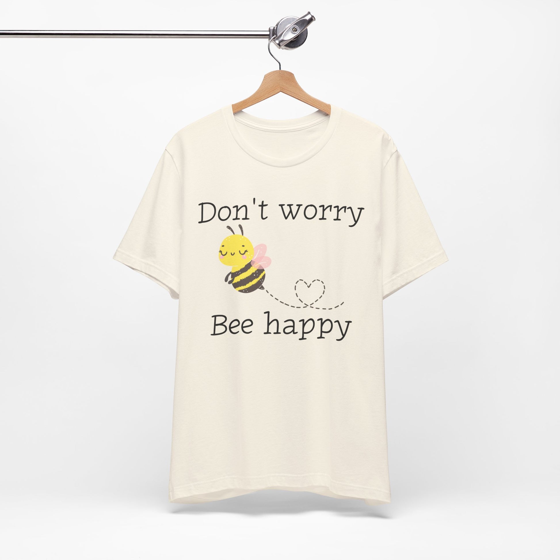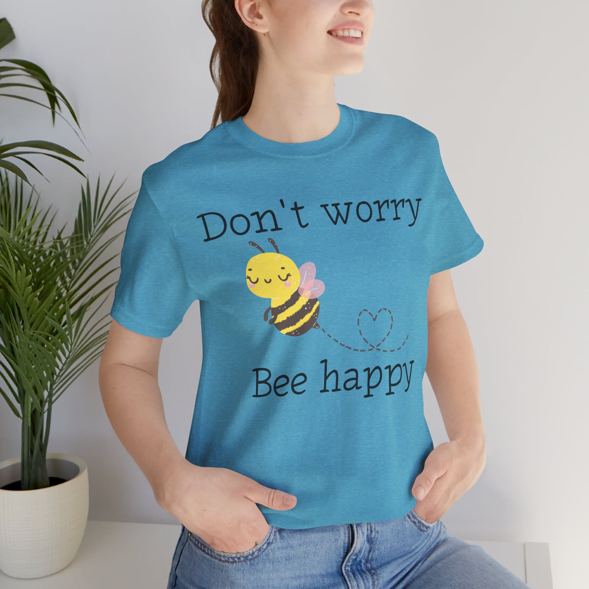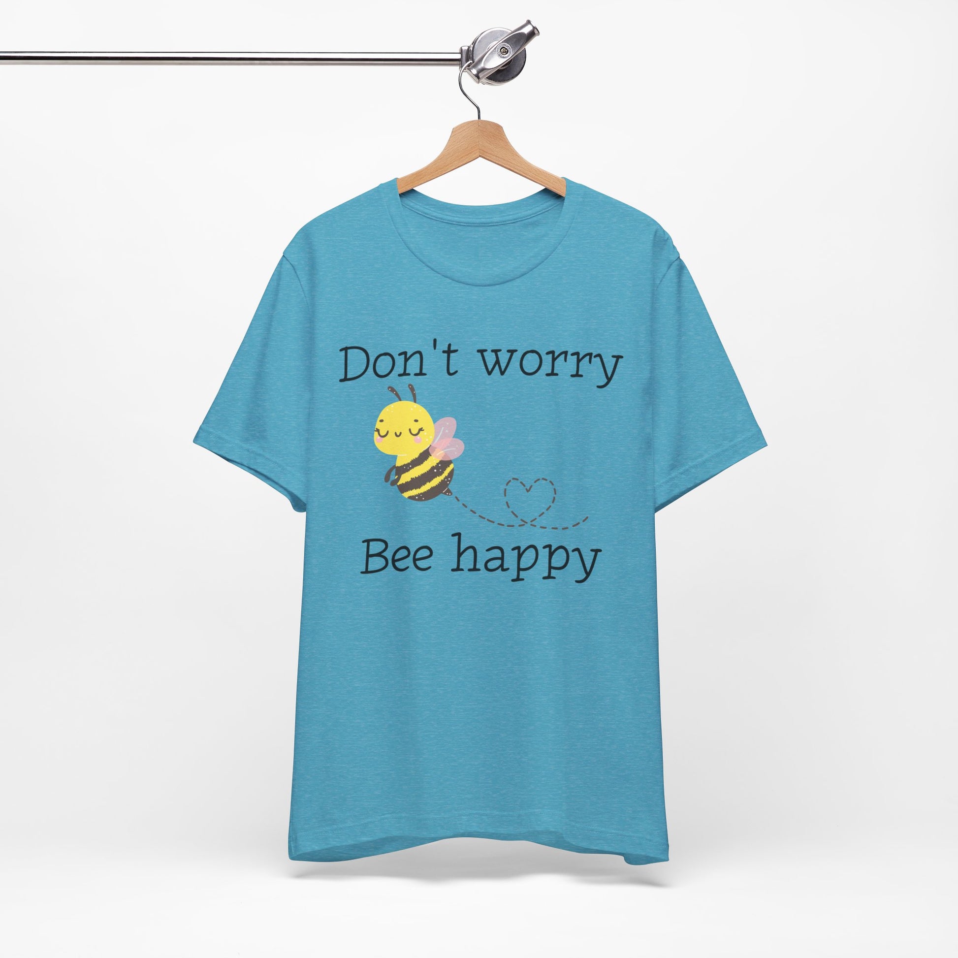 Stay cheerful with our "Don't Worry, Bee Happy" t-shirt, featuring an adorable bee graphic. This punny and positive tee is perfect for bee lovers or anyone who needs a little reminder to stay happy.