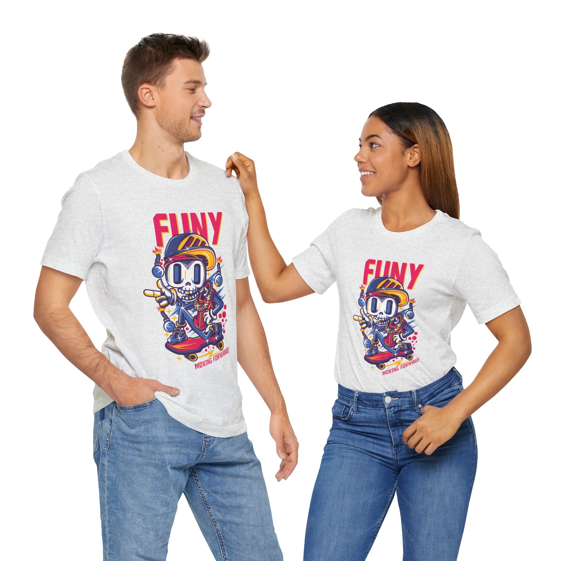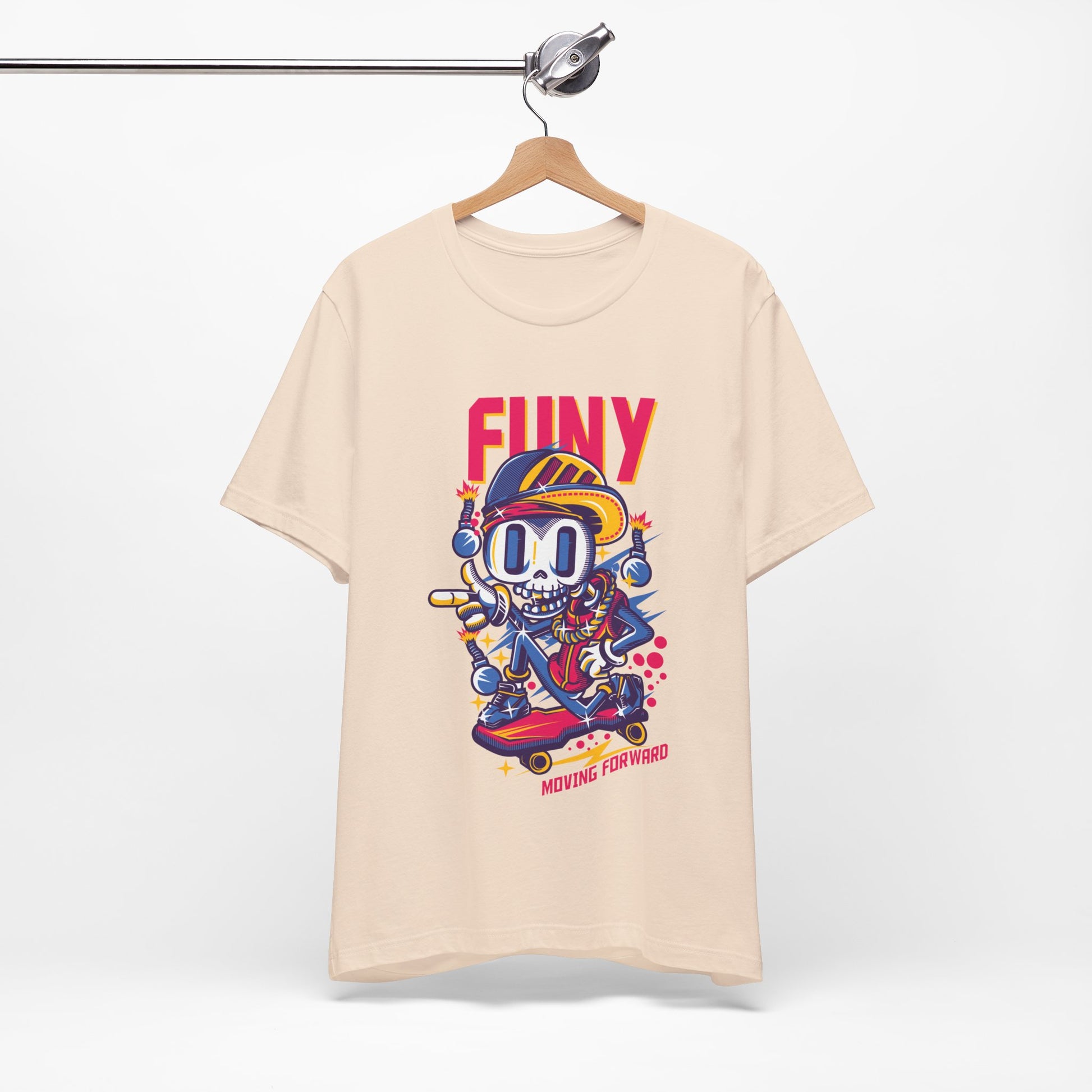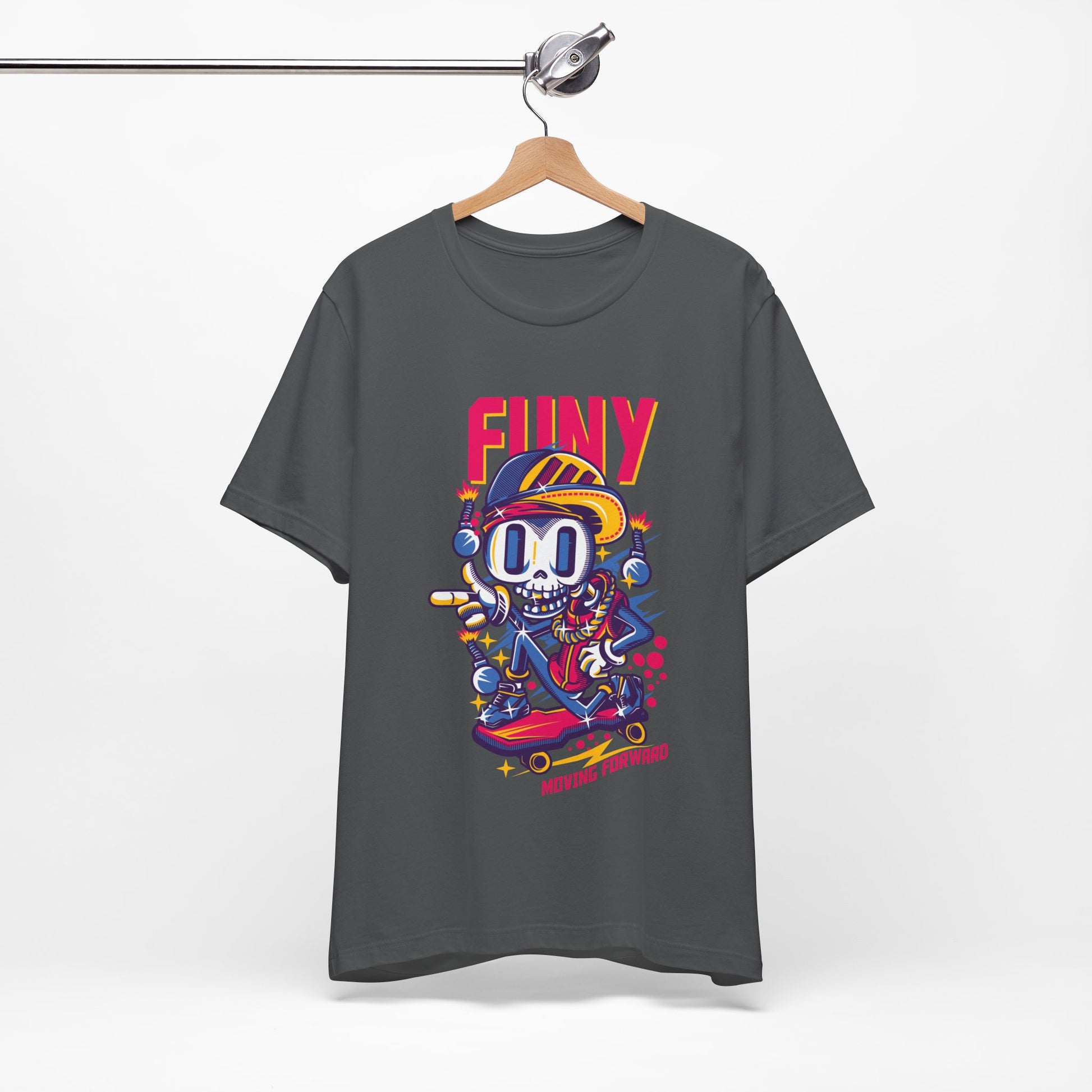 Roll forward with positive vibes in our "Funy Moving Forward" t-shirt! This vibrant graphic features a cool skeleton on a skateboard, surrounded by stars and explosive elements, embodying a playful and determined spirit. Perfect for skateboard enthusiasts and those who appreciate unique, energetic graphic tees.