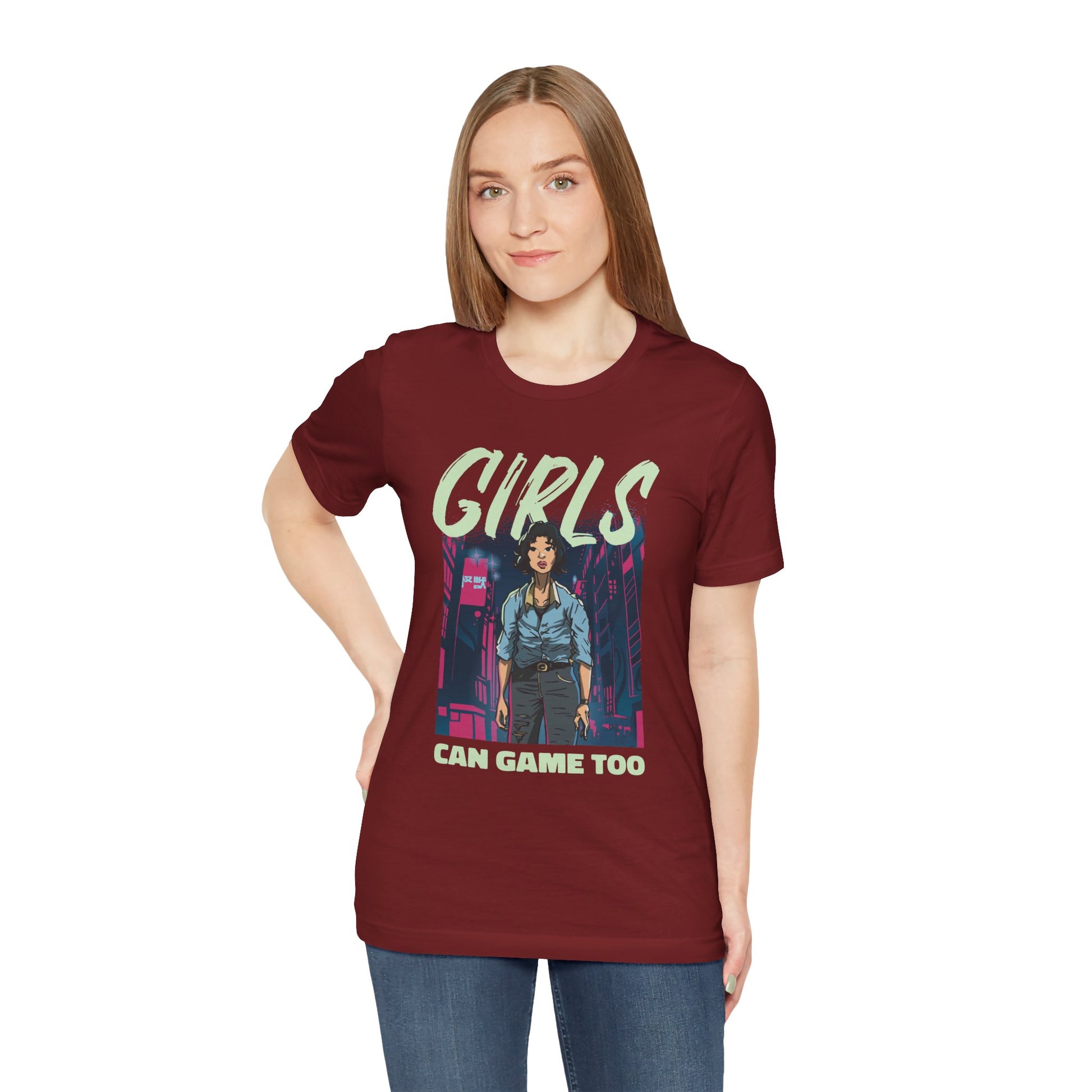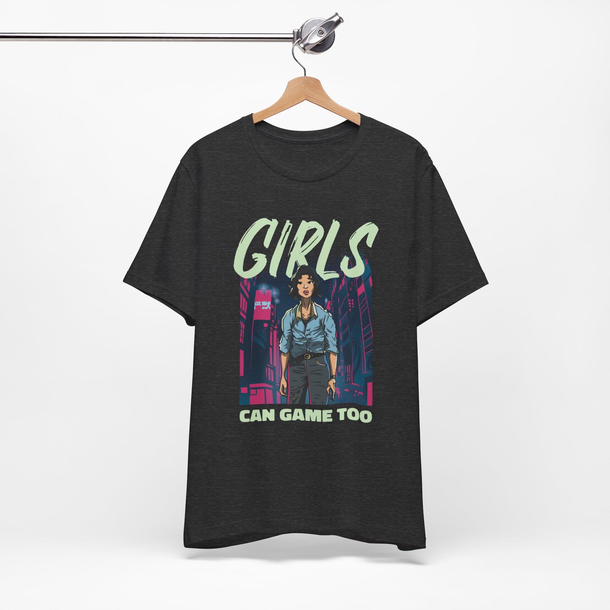 Empower the gamer girl in your life with this "Girls Can Game Too" t-shirt! Featuring a confident female character against a futuristic city backdrop, this design champions inclusivity in gaming. Perfect for female gamers and allies who love stylish, empowering graphic tees.