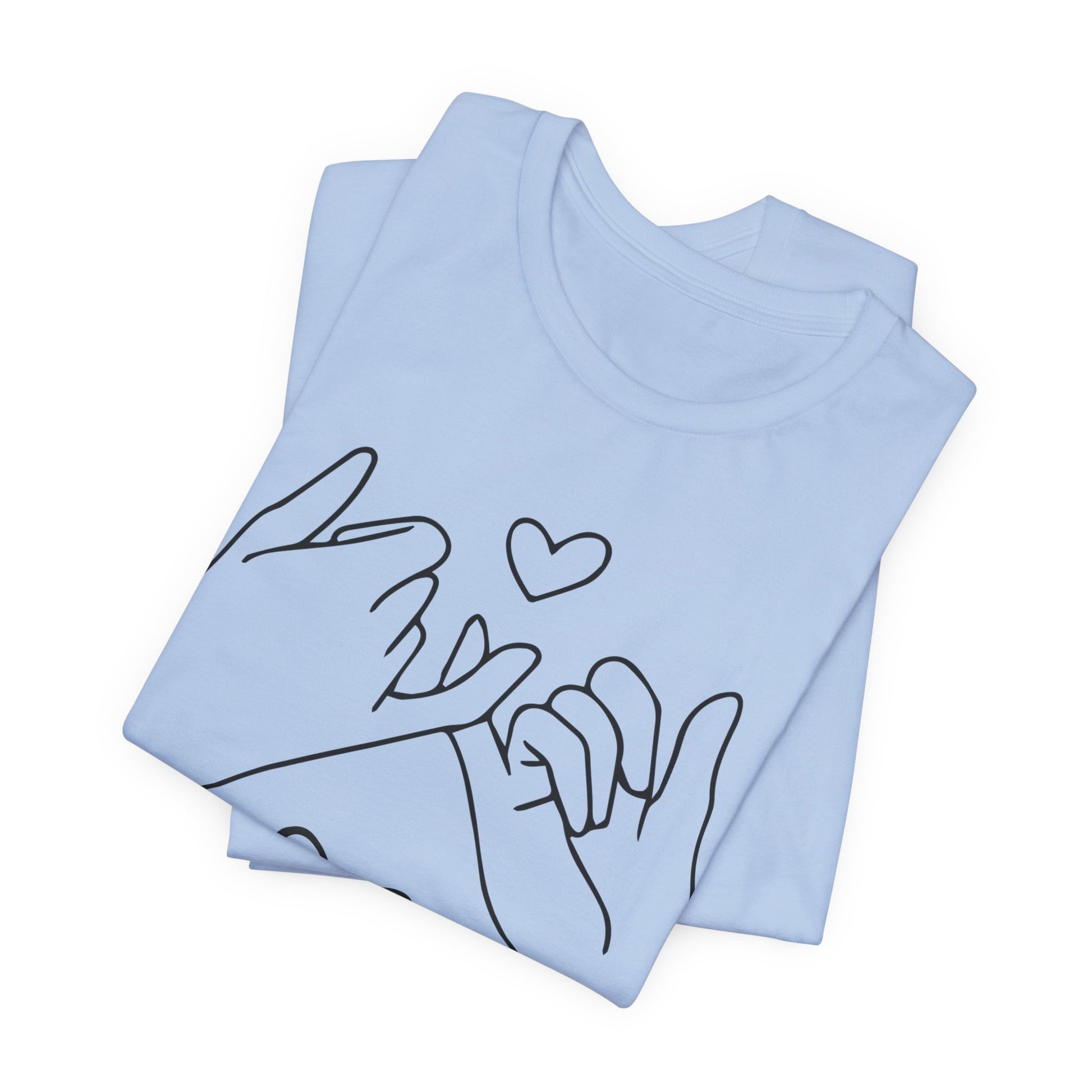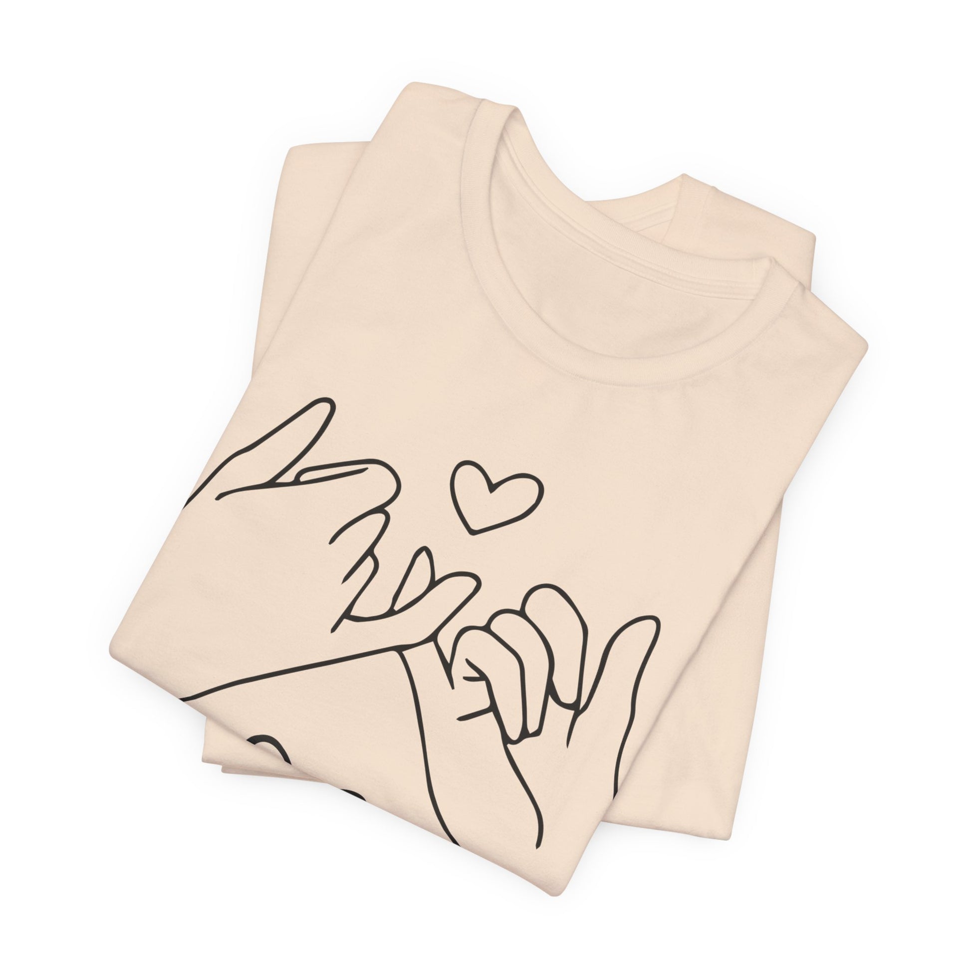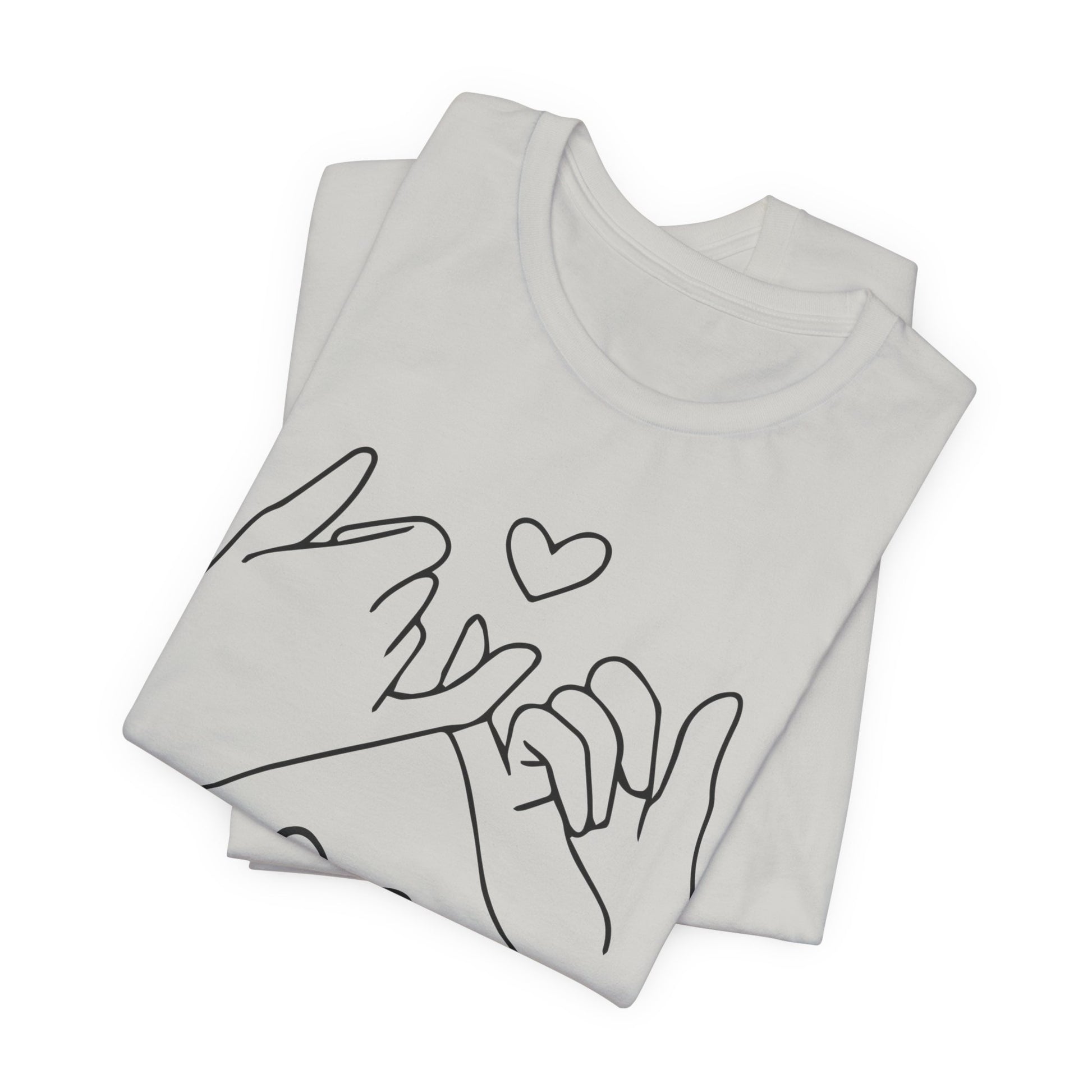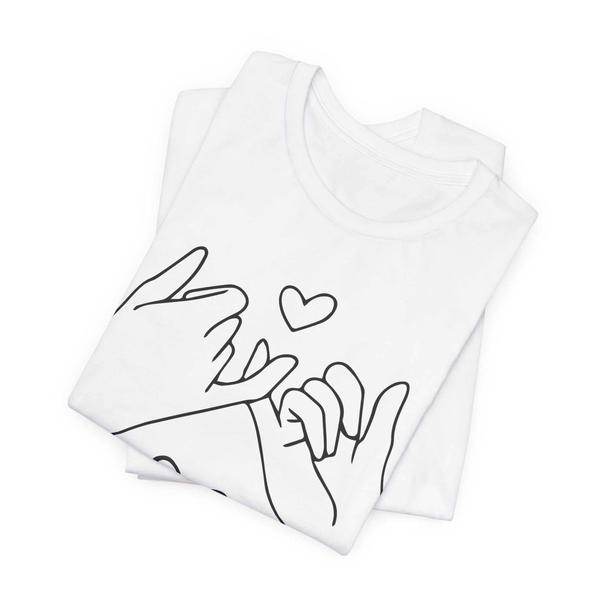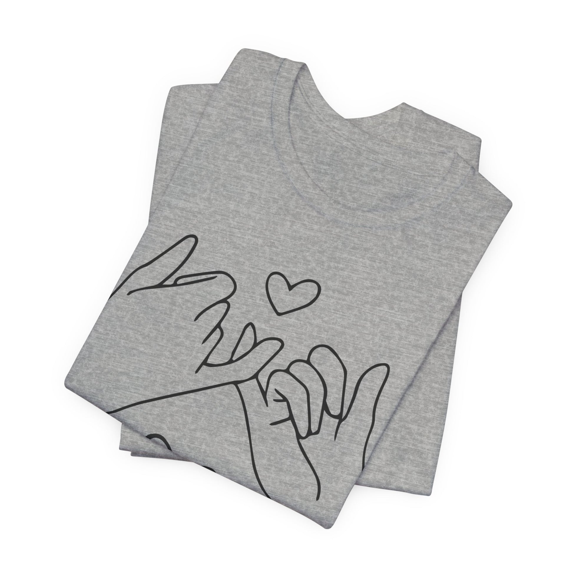 Introducing our cozy and stylish Unisex Jersey Short Sleeve Tee, perfect for everyday wear or special occasions. This shirt exudes a warm and inviting vibe, making it an ideal choice for casual outings or relaxed gatherings. The charming design features illustrated hands forming a promise, perfect for expressing love and connection between friends, family, or partners.