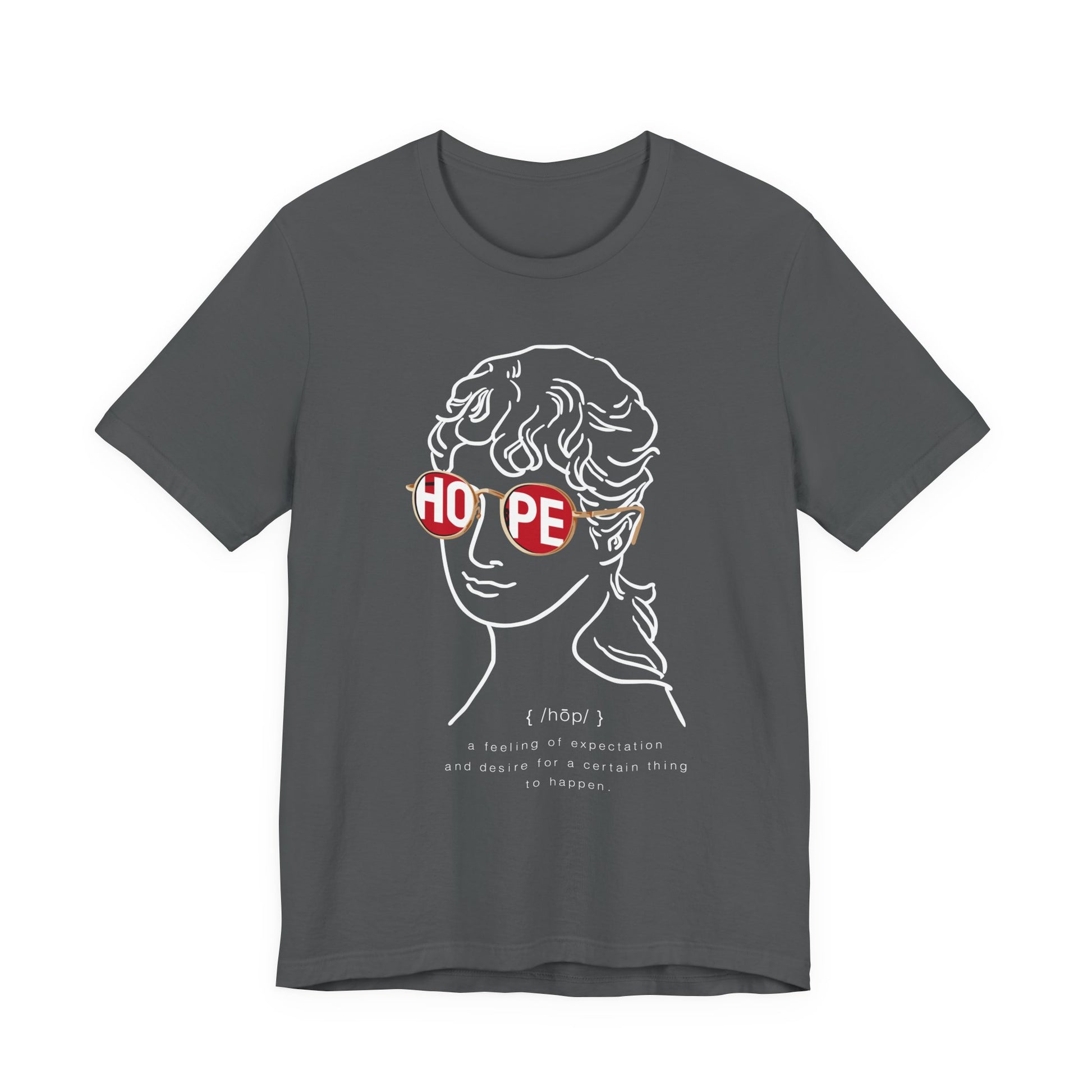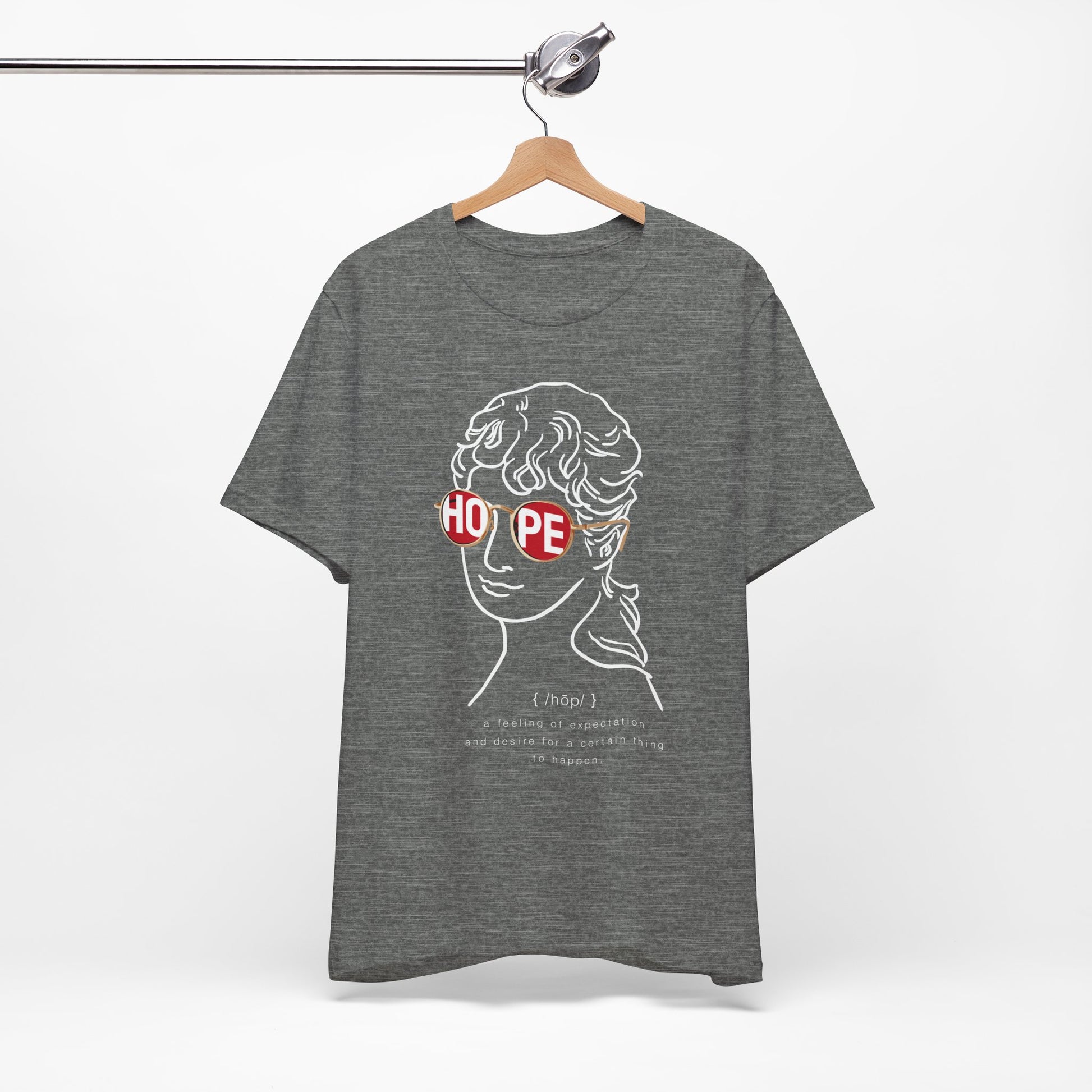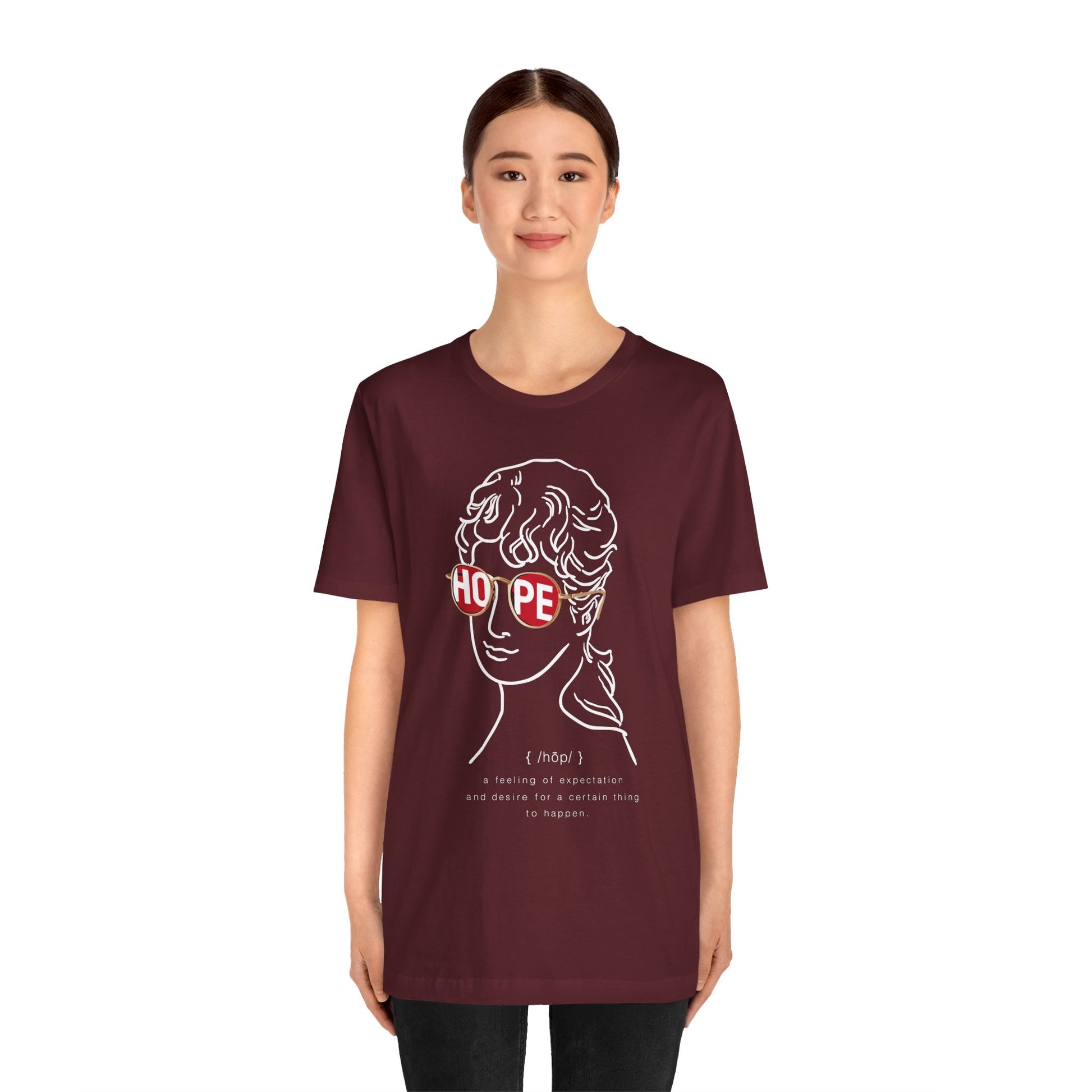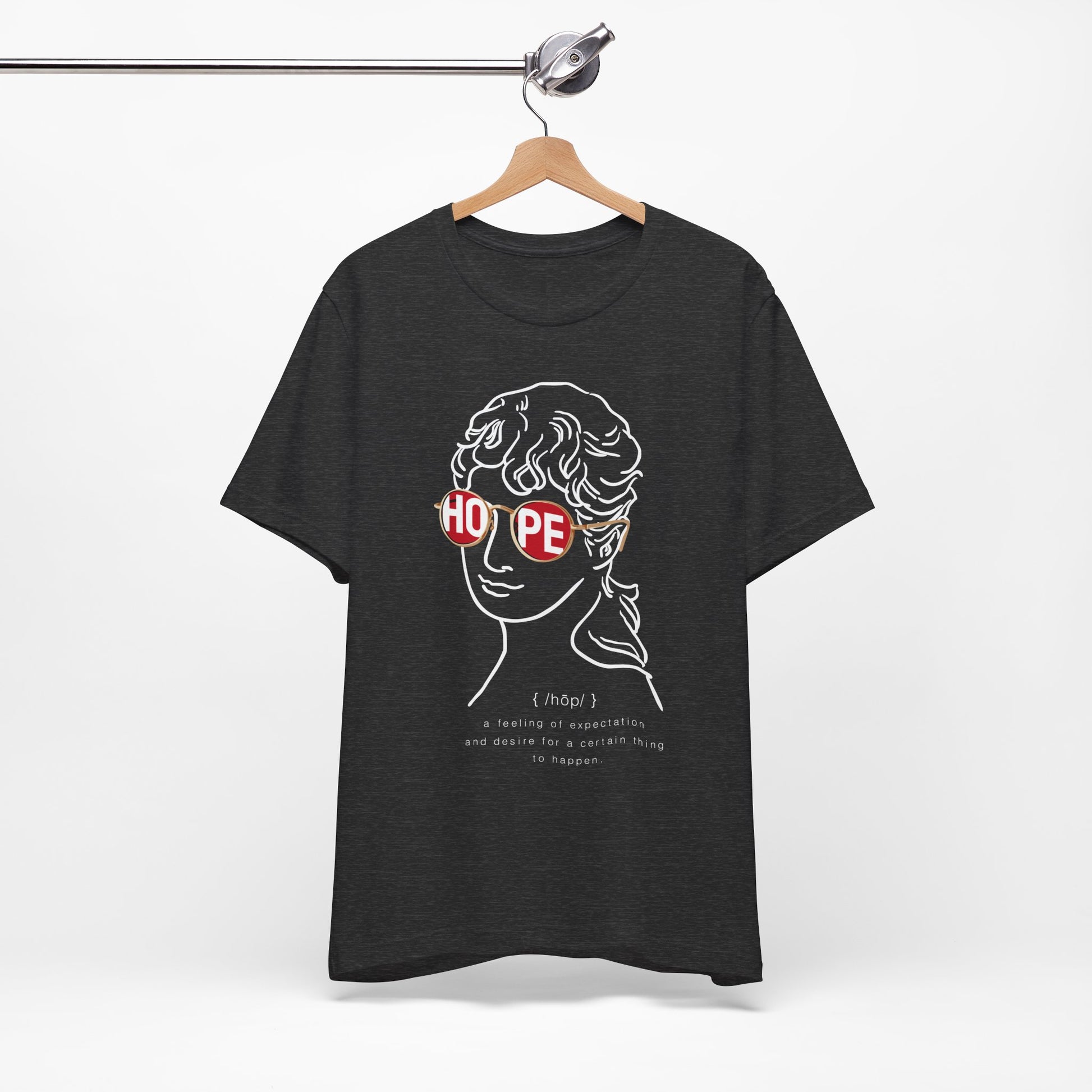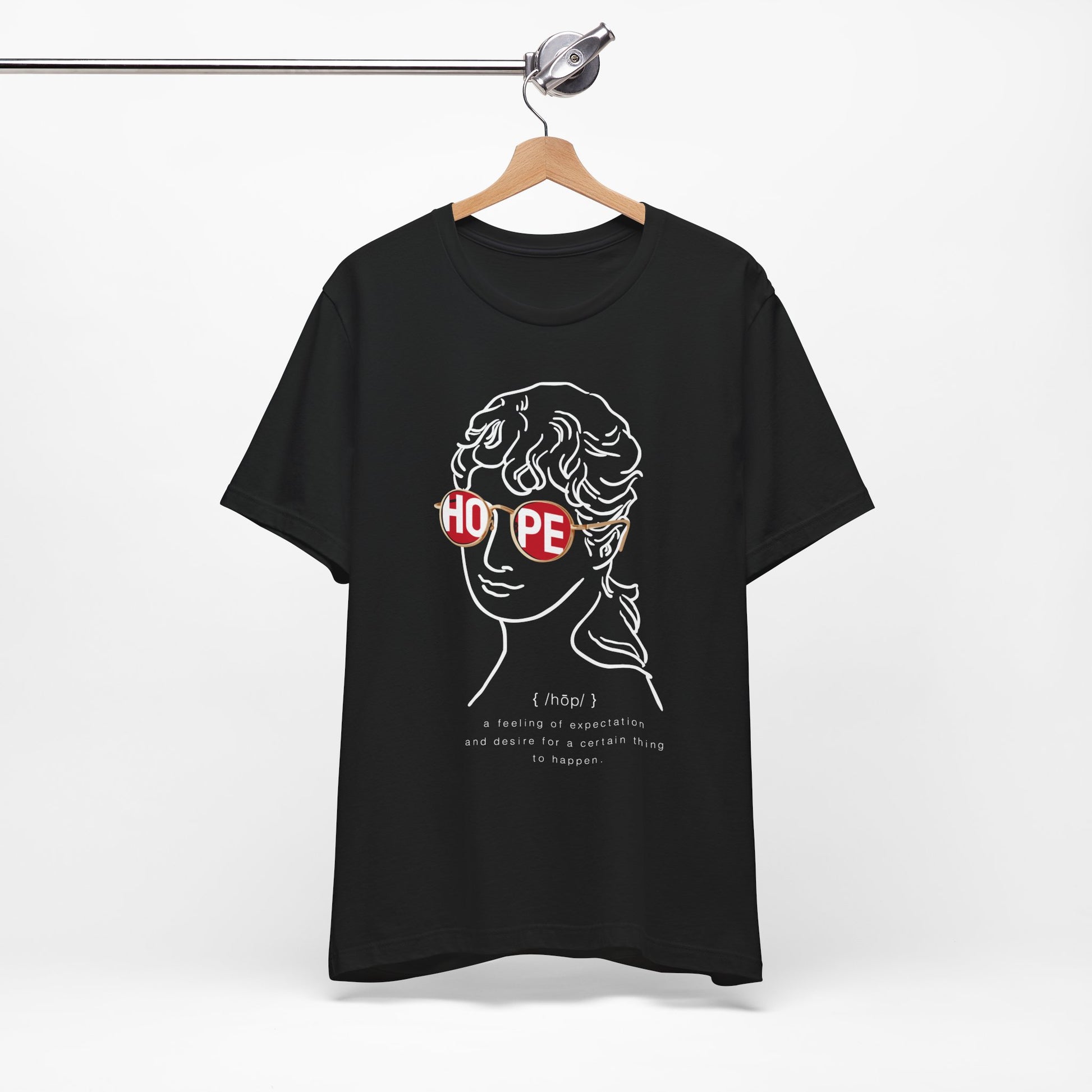 Inspire positivity with our "Hope" definition t-shirt. This minimalist design features a classical bust wearing glasses that spell out "HOPE," accompanied by its phonetic spelling and meaning. A thoughtful and stylish statement for those who value optimism.