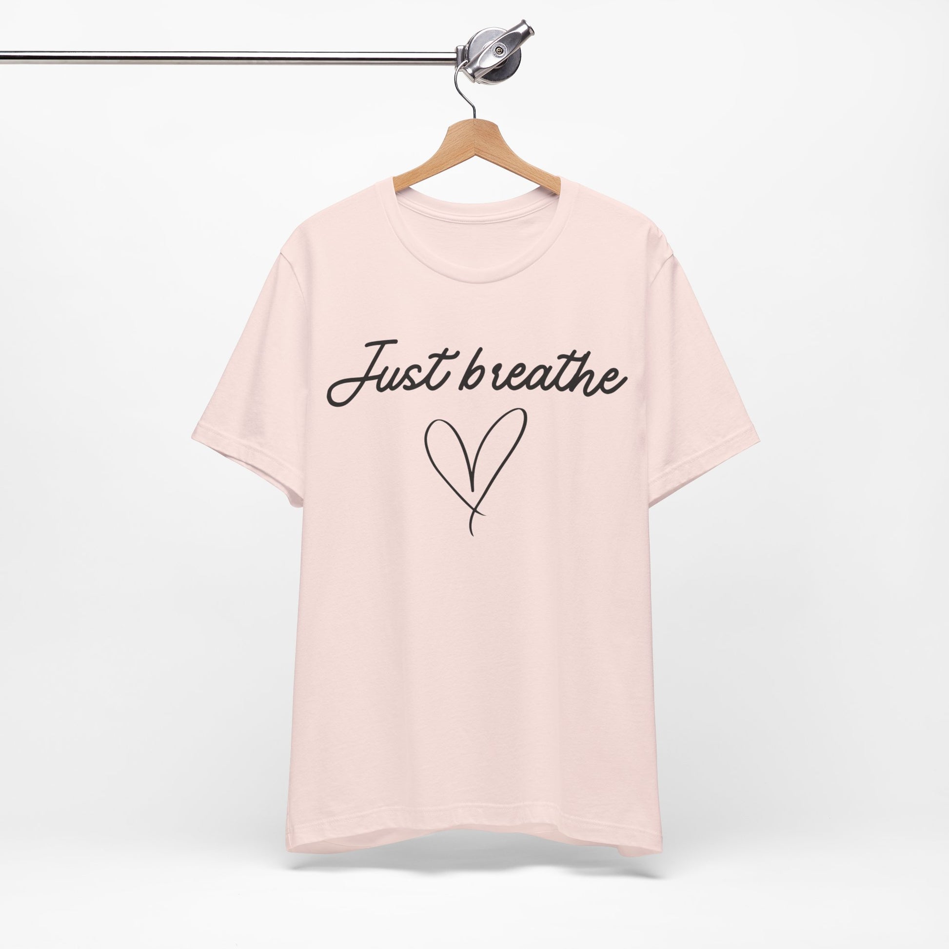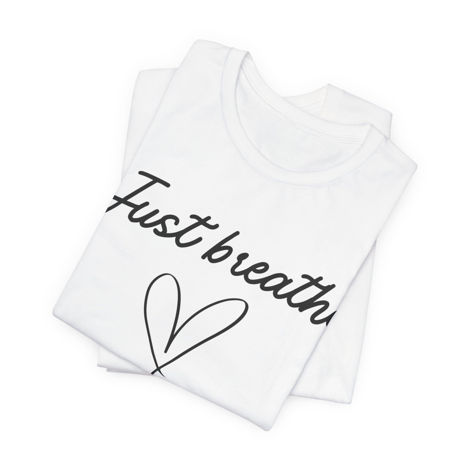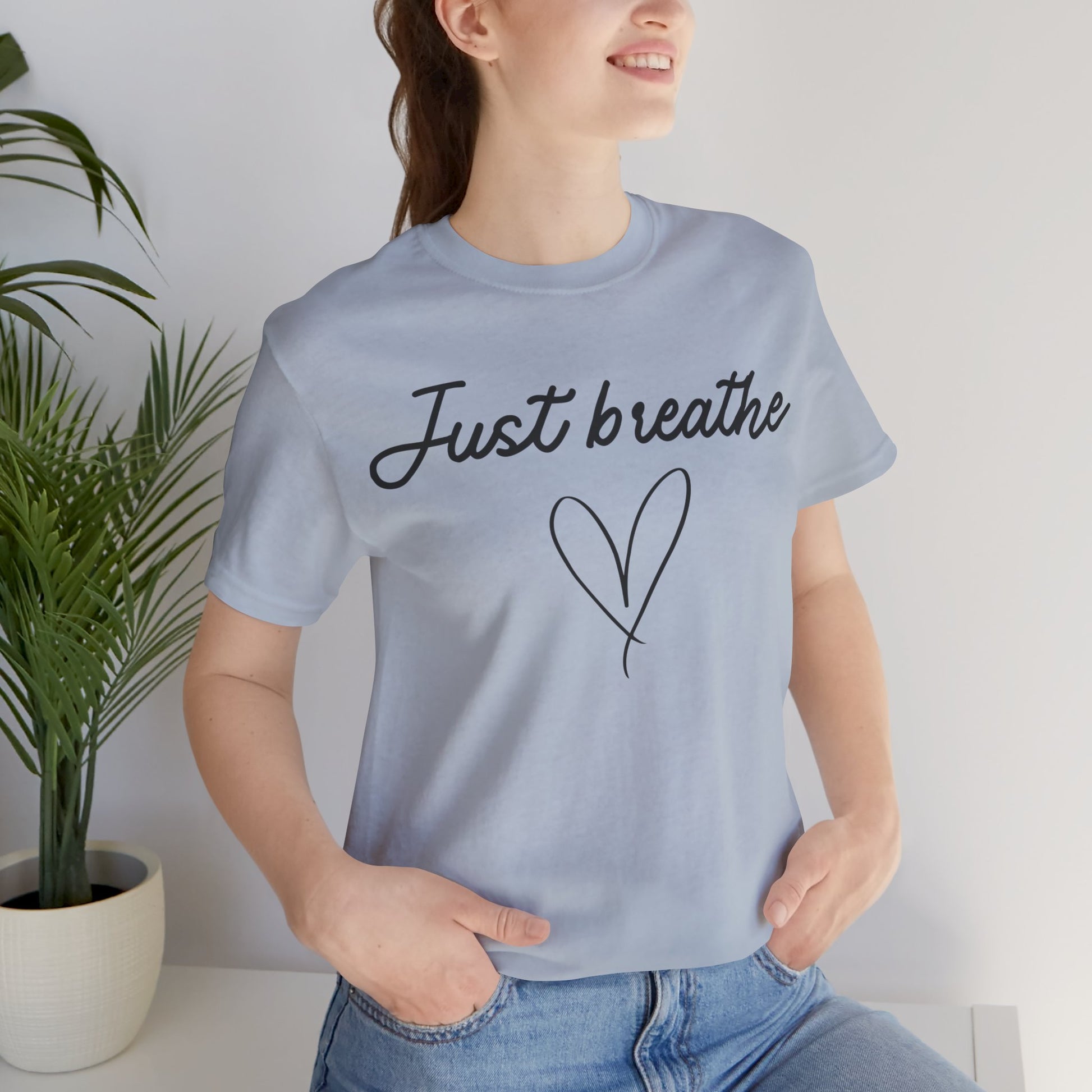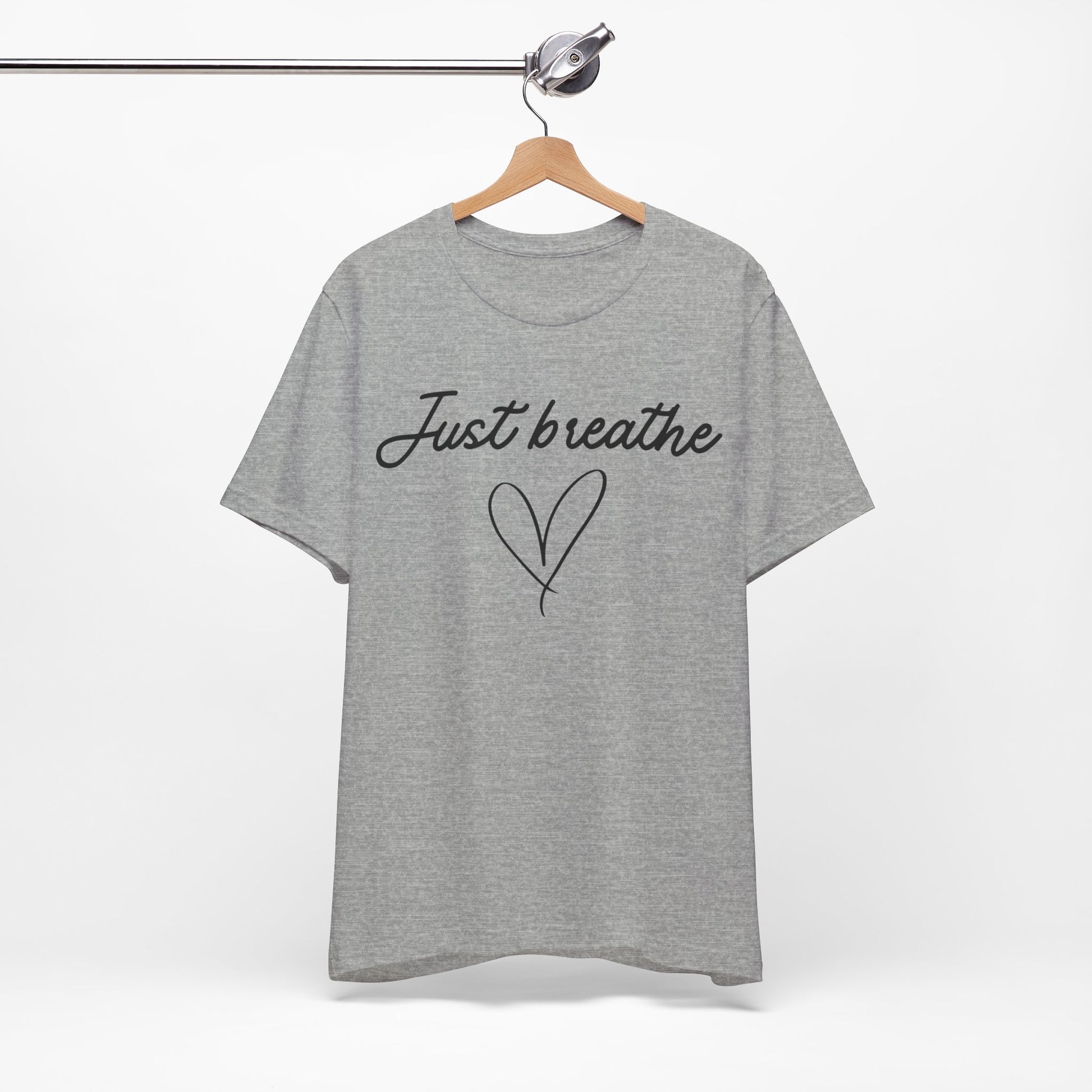 Embrace a sense of calm and positivity with this Unisex Jersey Short Sleeve Tee. Featuring the uplifting phrase "Just breathe" paired with a sweet heart design, this tee is perfect for those seeking a moment of tranquility in their busy lives. Made from ultra-soft, breathable fabric, it offers all-day comfort for casual outings, yoga sessions, or lounging at home. This versatile piece is suitable for anyone who values self-care and mindfulness, making it an ideal gift for friends and family during holidays like Christmas, birthdays, or just to show someone you care. Perfect for everyday wear, it seamlessly fits into both relaxed and semi-formal environments, encouraging a peaceful atmosphere wherever you go.