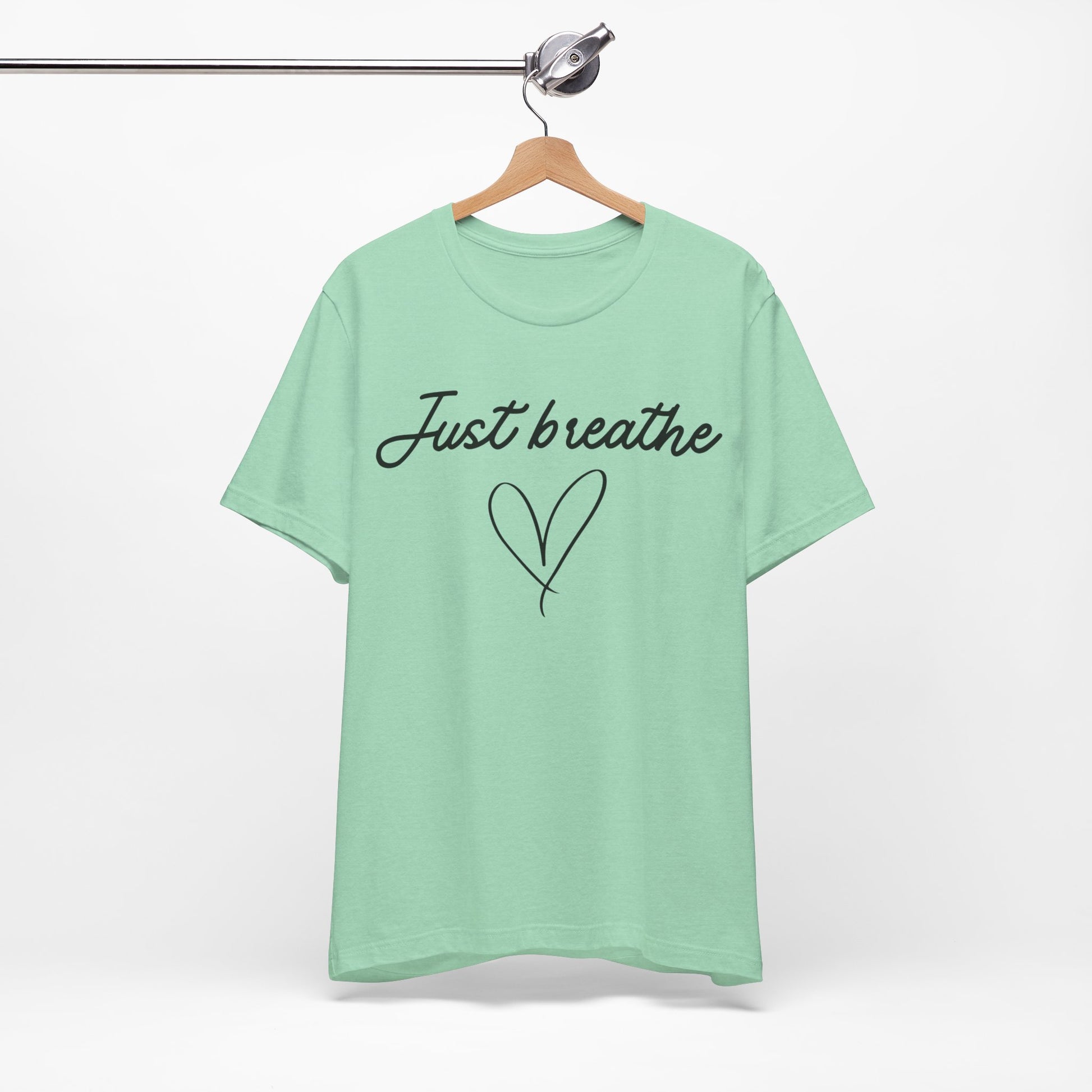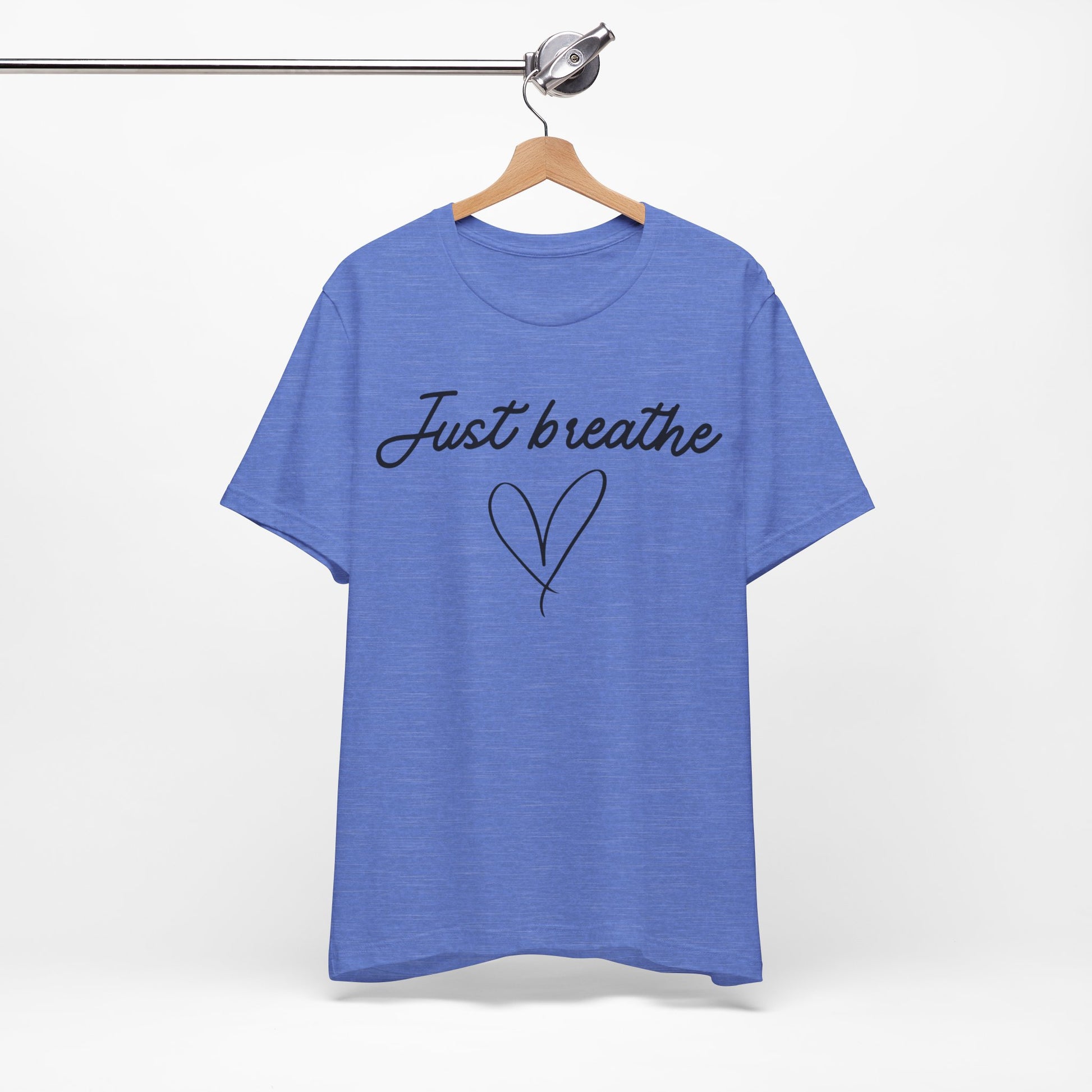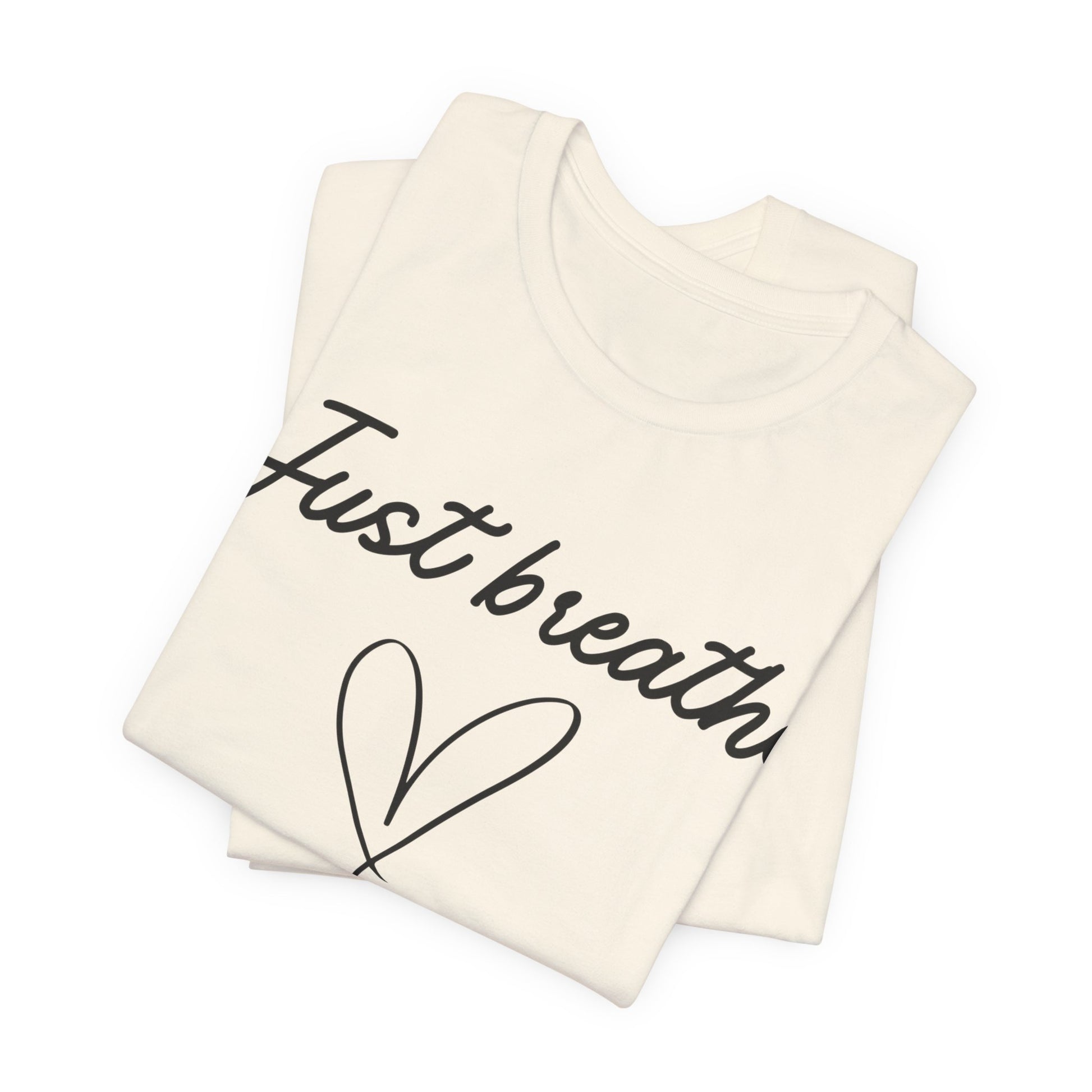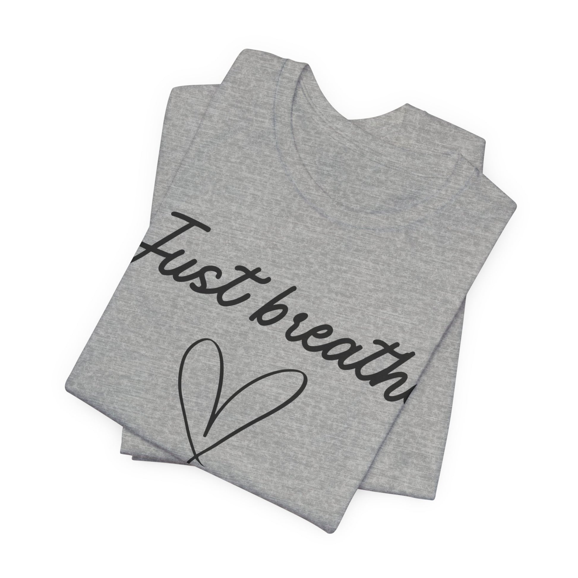 Embrace a sense of calm and positivity with this Unisex Jersey Short Sleeve Tee. Featuring the uplifting phrase "Just breathe" paired with a sweet heart design, this tee is perfect for those seeking a moment of tranquility in their busy lives. Made from ultra-soft, breathable fabric, it offers all-day comfort for casual outings, yoga sessions, or lounging at home. This versatile piece is suitable for anyone who values self-care and mindfulness, making it an ideal gift for friends and family during holidays like Christmas, birthdays, or just to show someone you care. Perfect for everyday wear, it seamlessly fits into both relaxed and semi-formal environments, encouraging a peaceful atmosphere wherever you go.