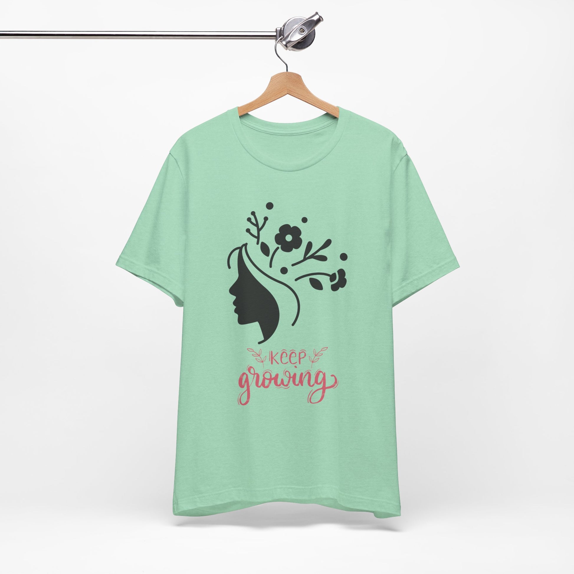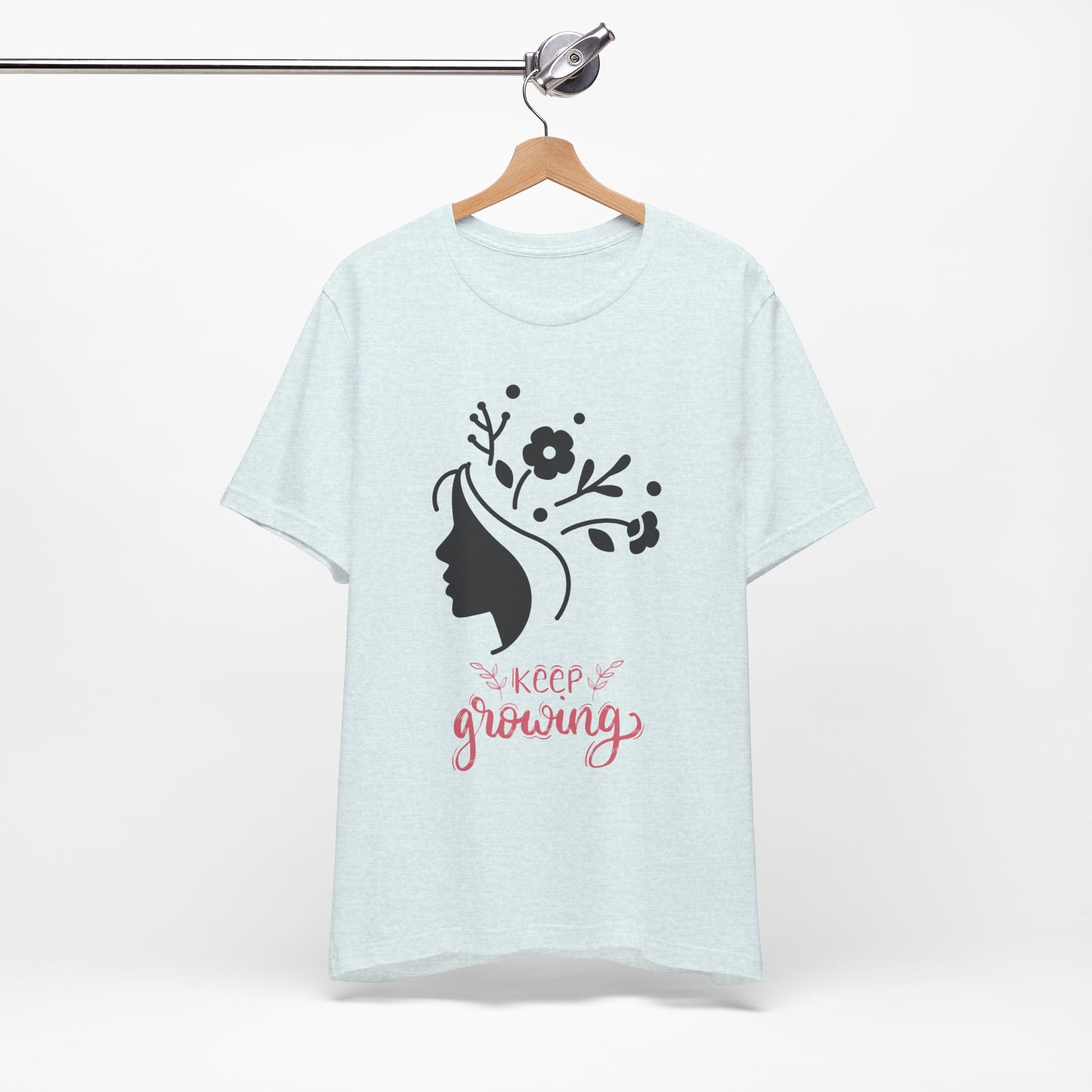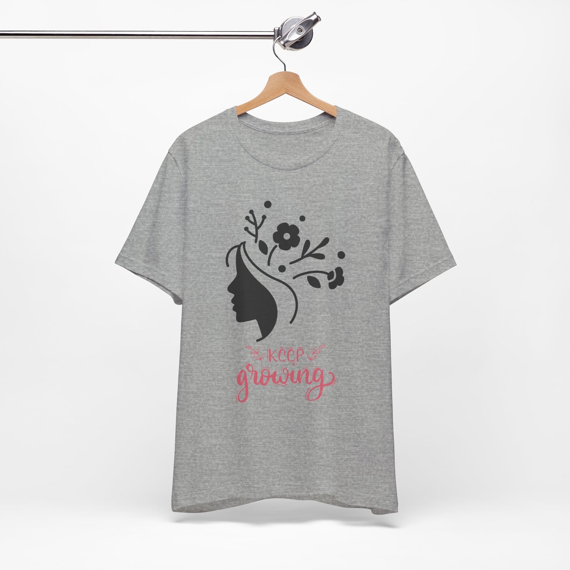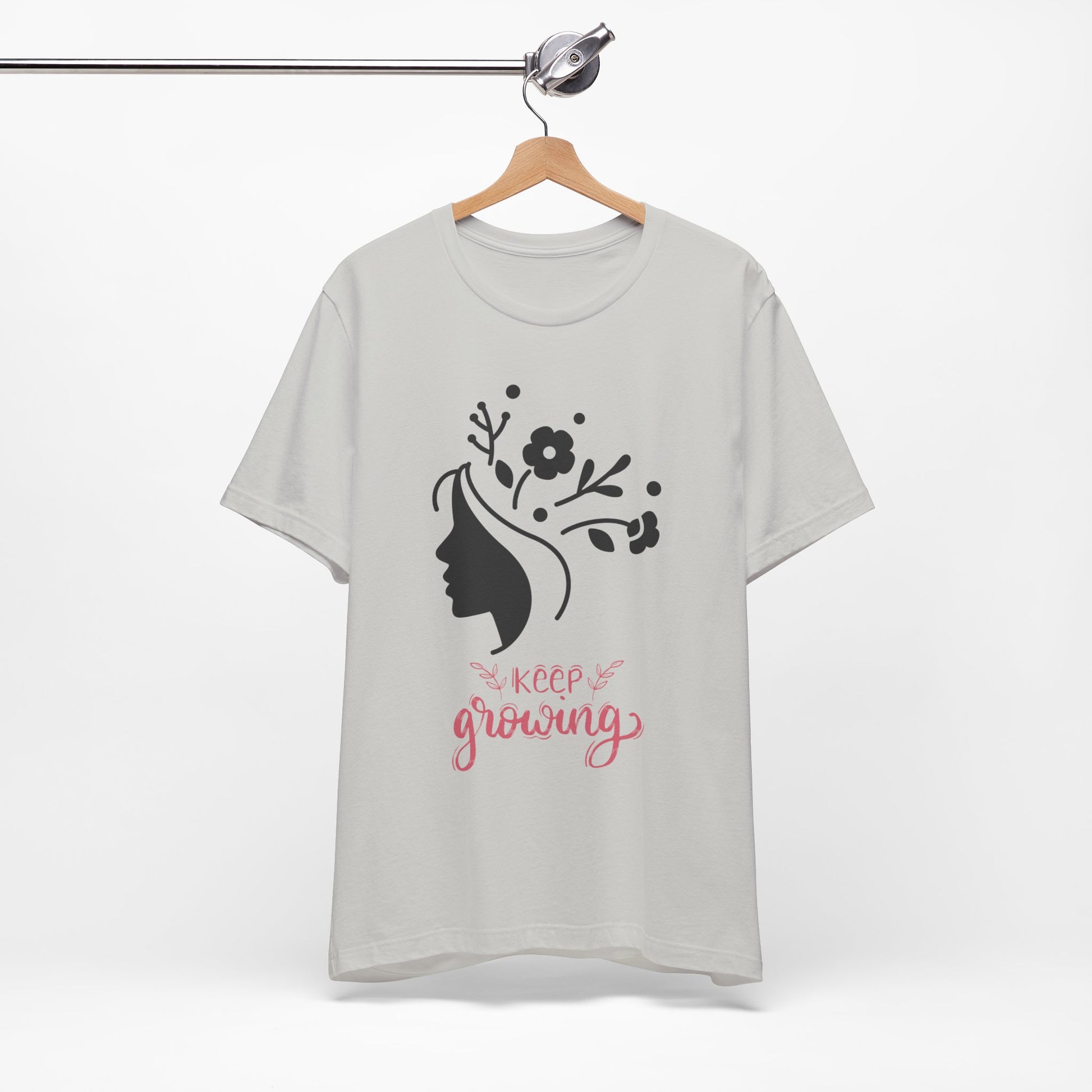 Celebrate personal growth with our "Keep Growing" t-shirt, featuring a beautiful silhouette of a woman with flowers in her hair. This inspiring and elegant design is a perfect reminder of resilience and self-development.
