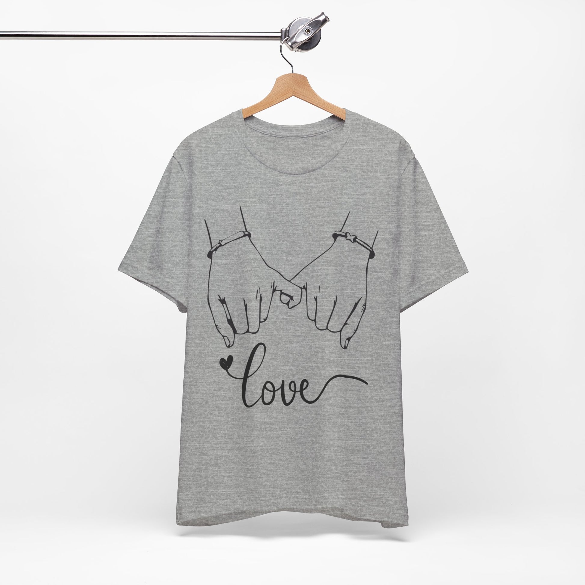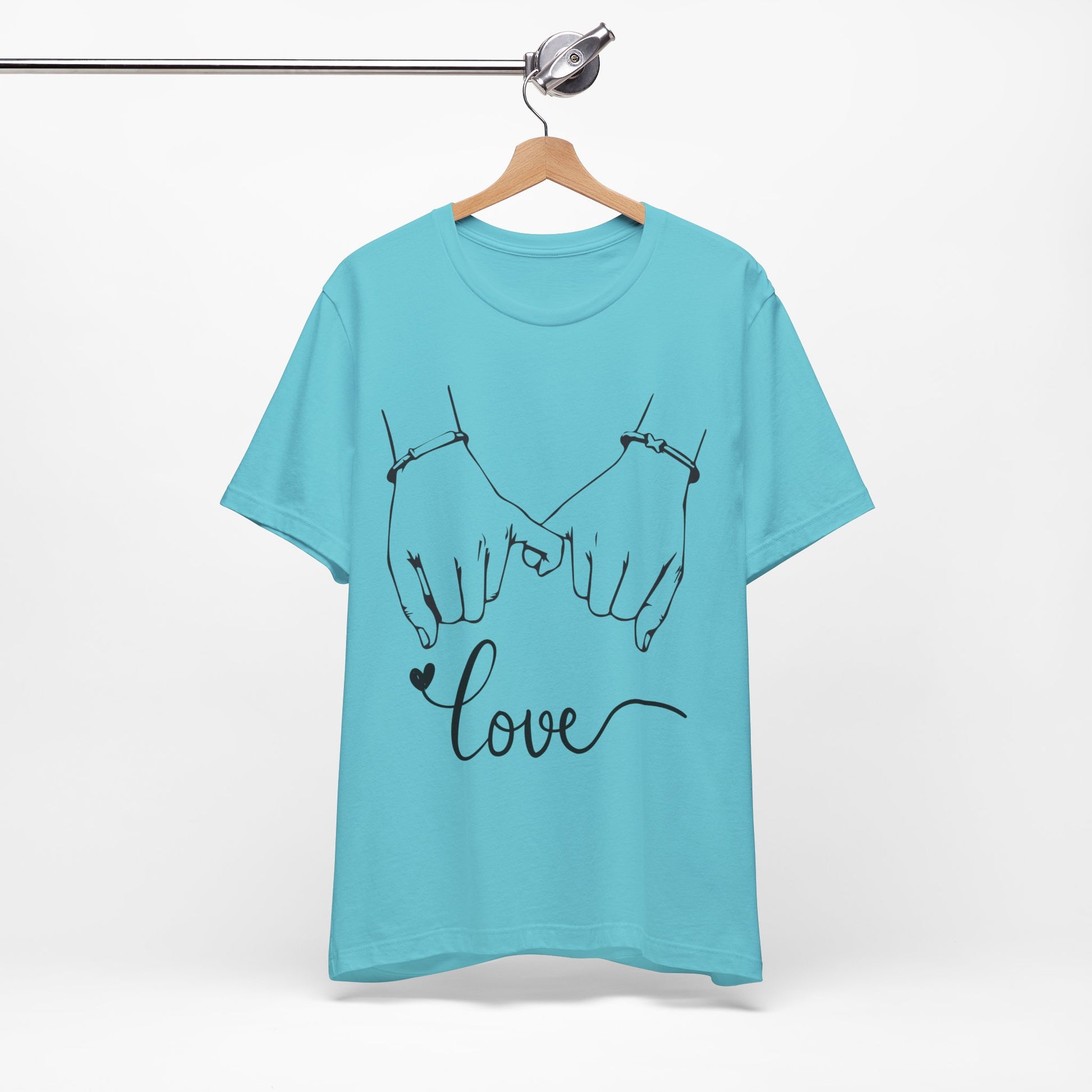 Embrace love with this stylish unisex jersey short sleeve tee. The simple yet powerful design showcases a pair of hands intertwined with the word "love" elegantly scripted beneath, evoking feelings of connection and warmth. Perfect for casual outings, date nights, or just lounging at home, this tee seamlessly fits into any wardrobe, making a heartfelt statement wherever you go. Ideal for couples, friends, and anyone who celebrates love in all its forms. It’s a thoughtful gift for anniversaries, Valentine’s Day, or just because!