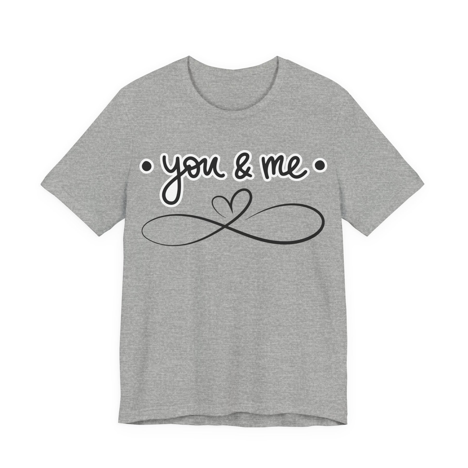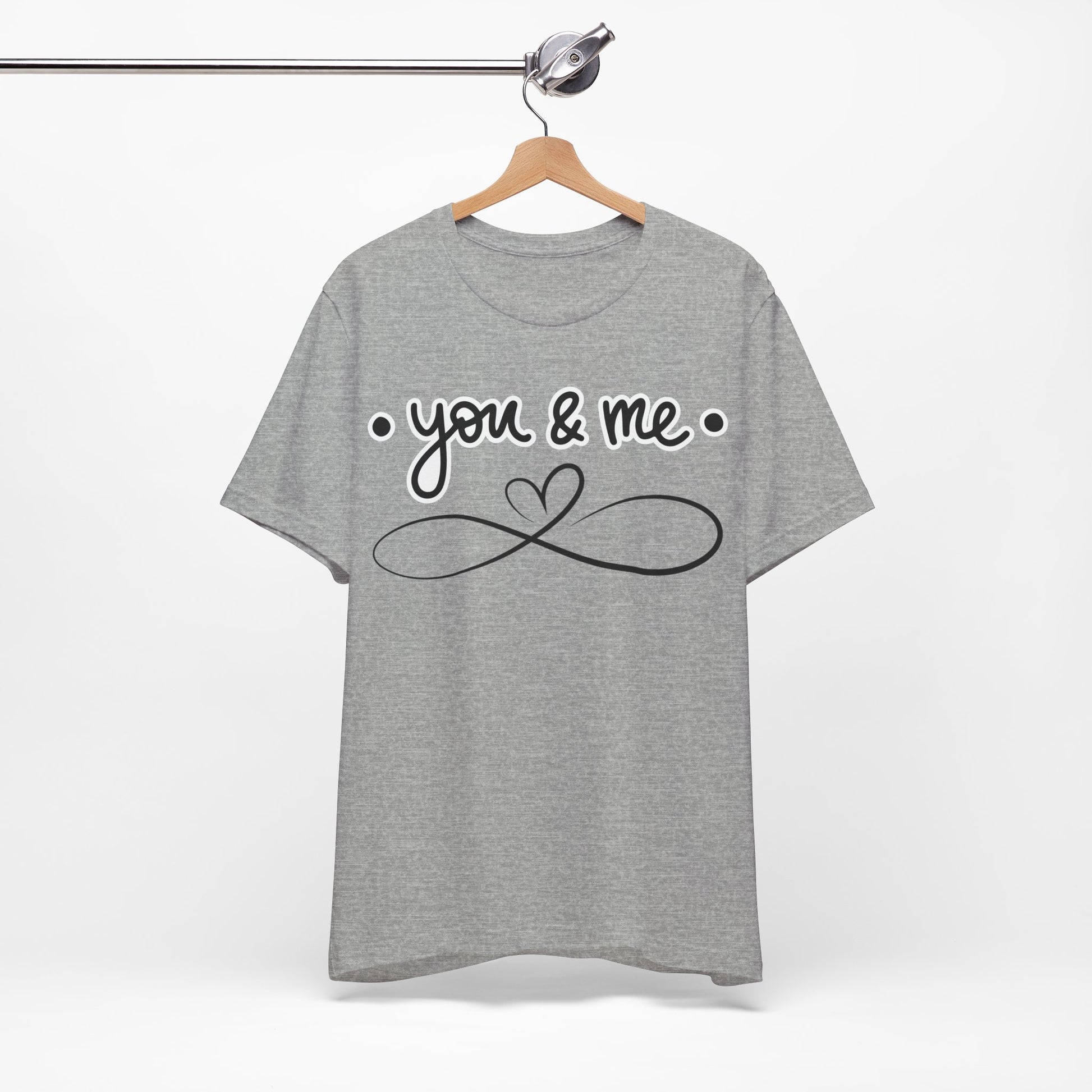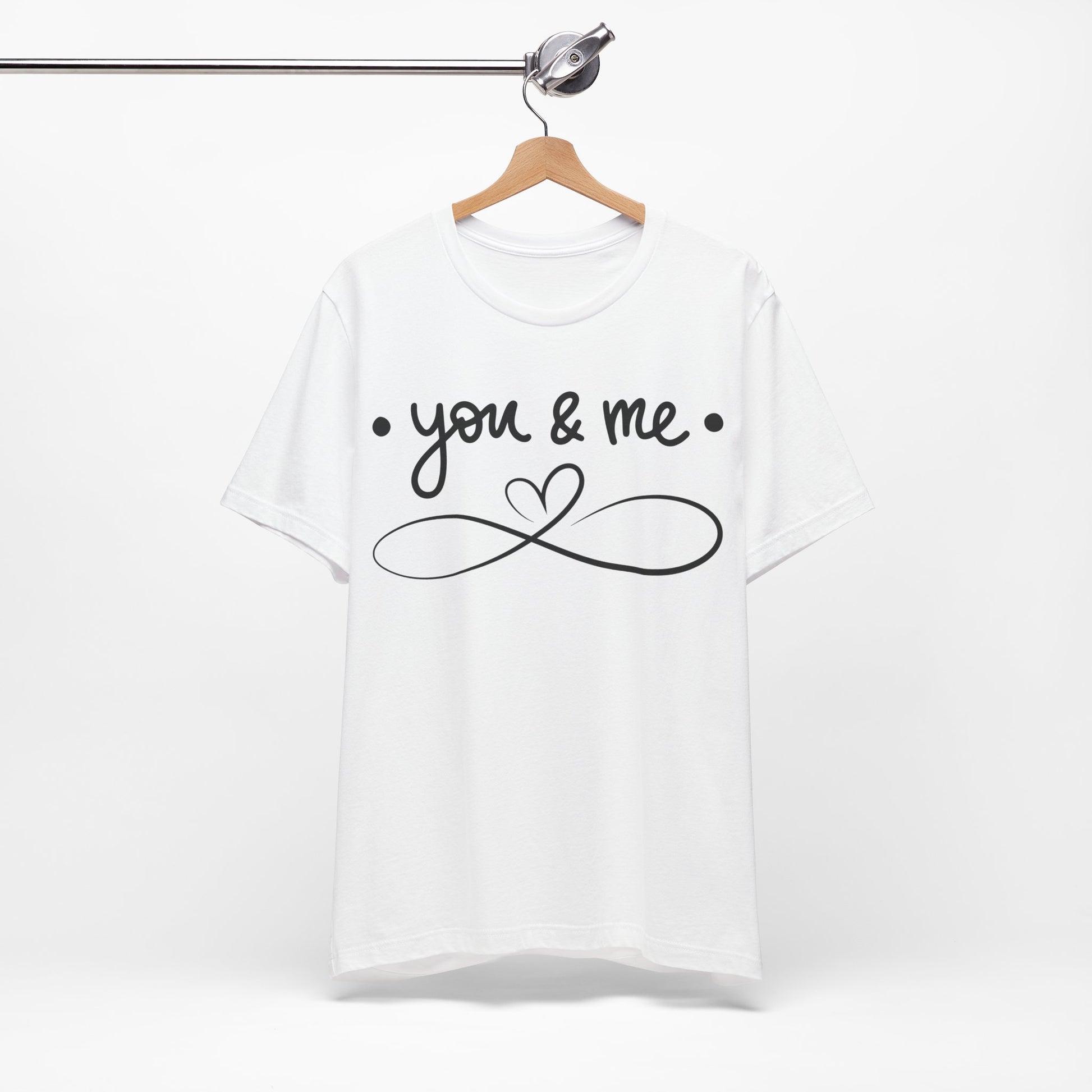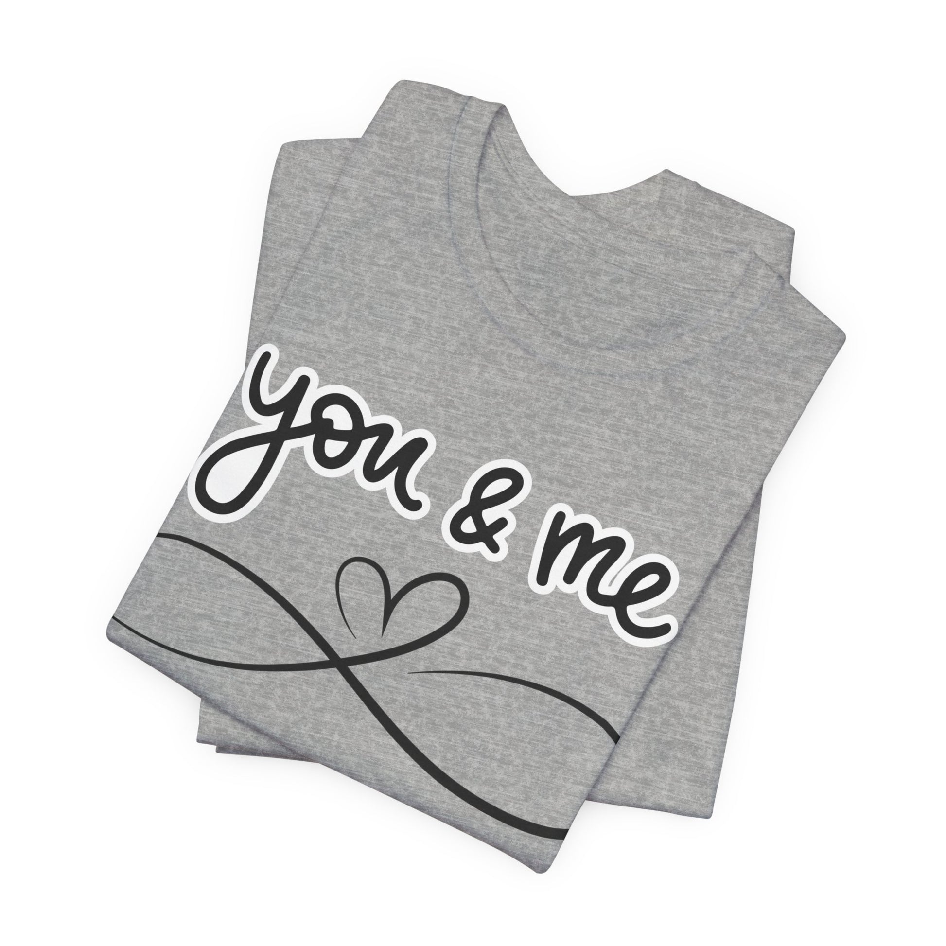 This Unisex Jersey Short Sleeve Tee is the perfect blend of style and comfort for everyday wear. Featuring a minimalist design that reads 'you & me' with an elegant heart, it evokes feelings of love and connection. Ideal for casual outings, this tee enhances any wardrobe, whether you're dressing up for a date night or enjoying a cozy day at home. It's a wonderful gift for couples, friends, or anyone celebrating love, making it suitable for occasions like anniversaries, Valentine's Day, or just to show appreciation for a loved one. With a gender-neutral fit, it caters to all, ensuring everyone can express their affection in comfort and style.
