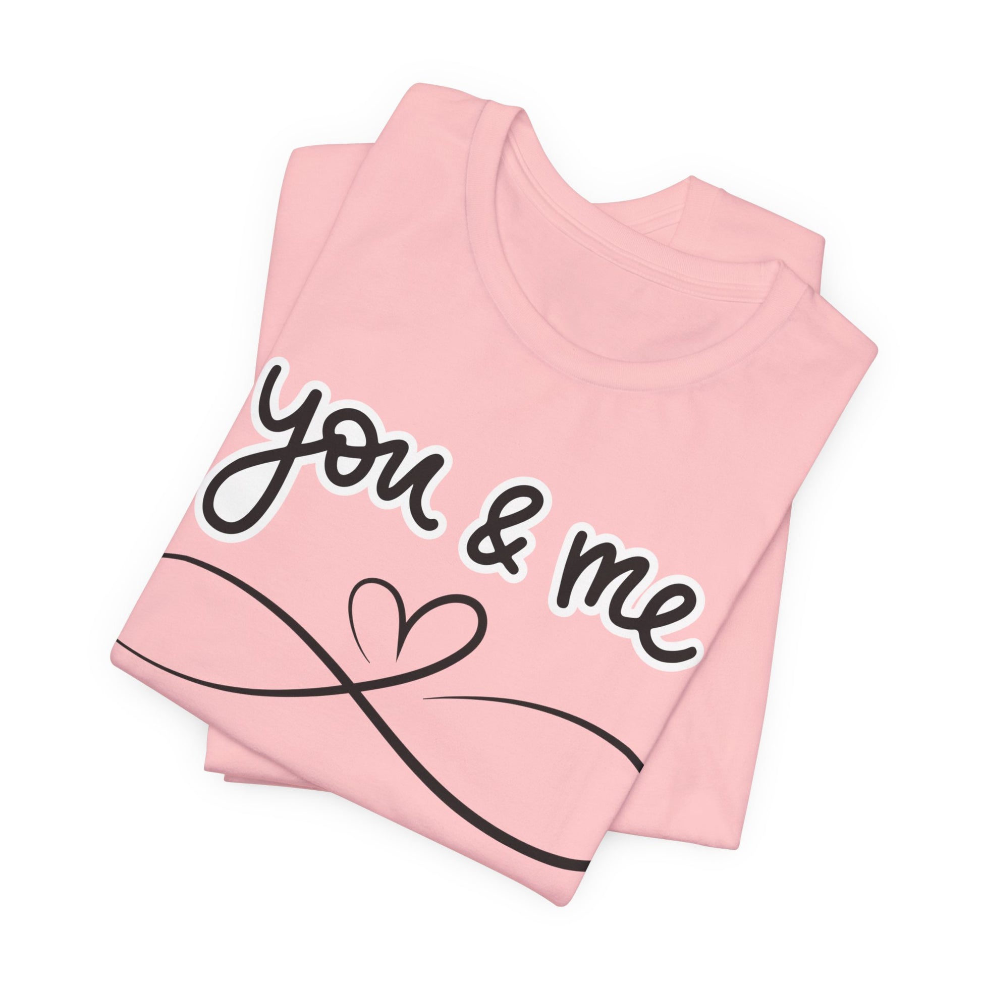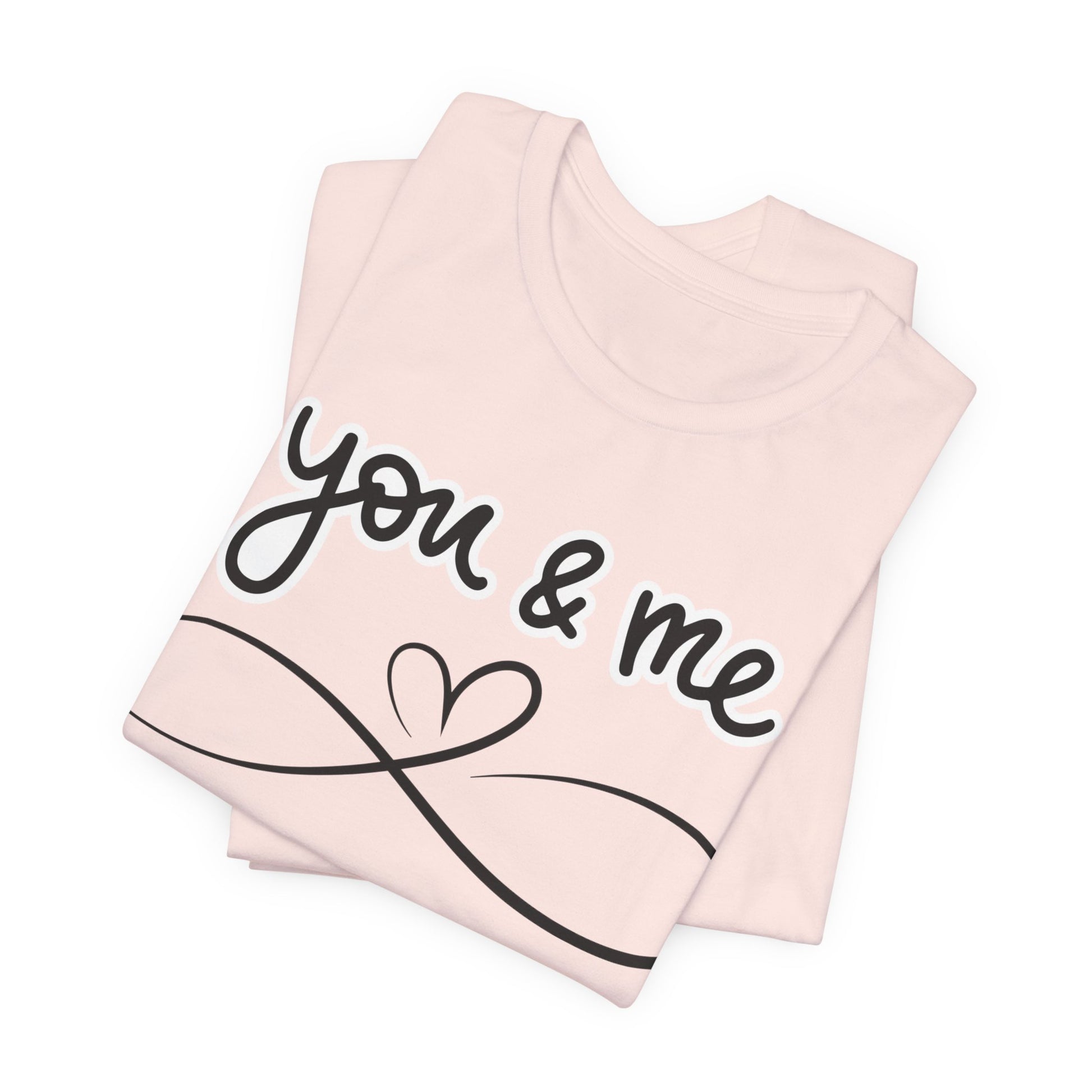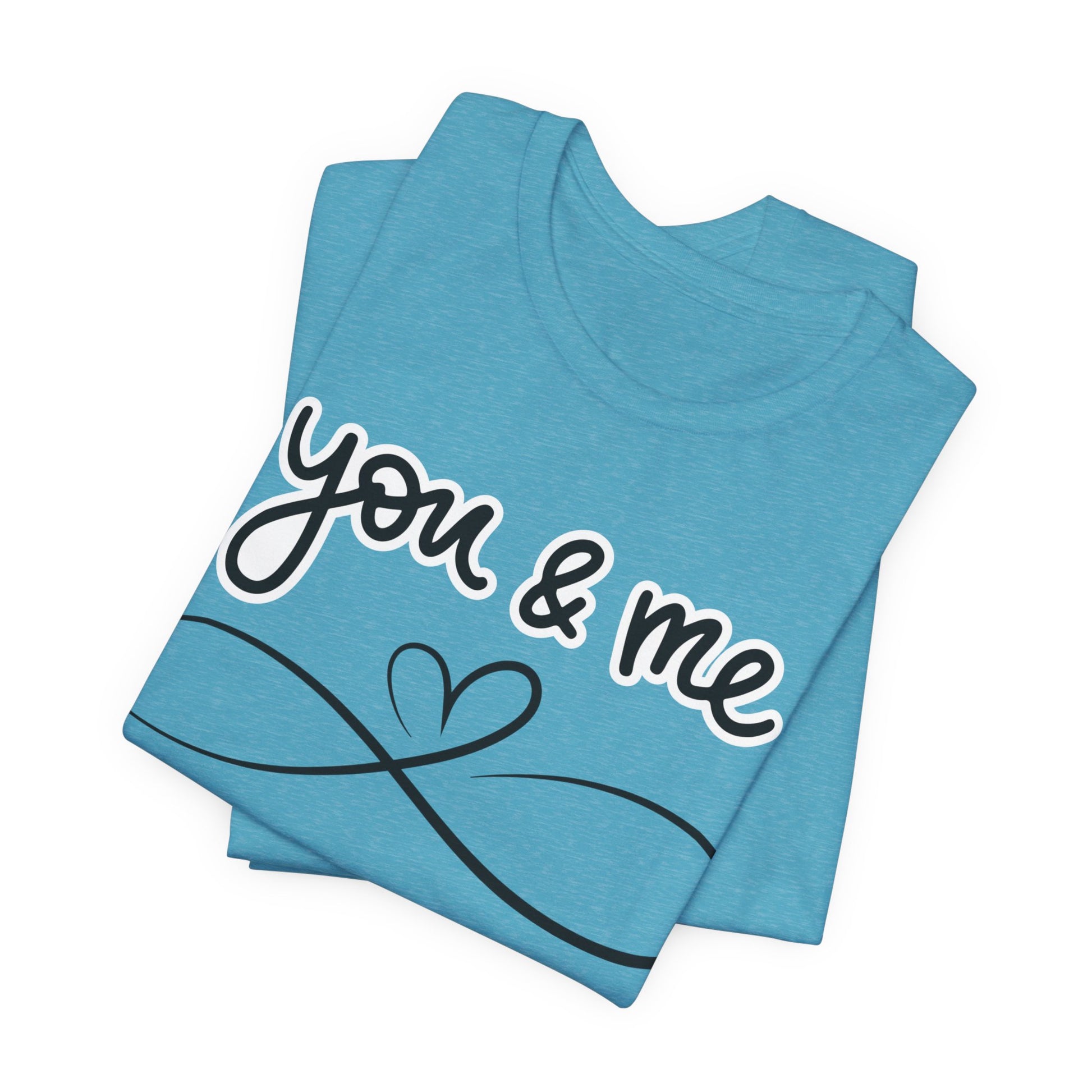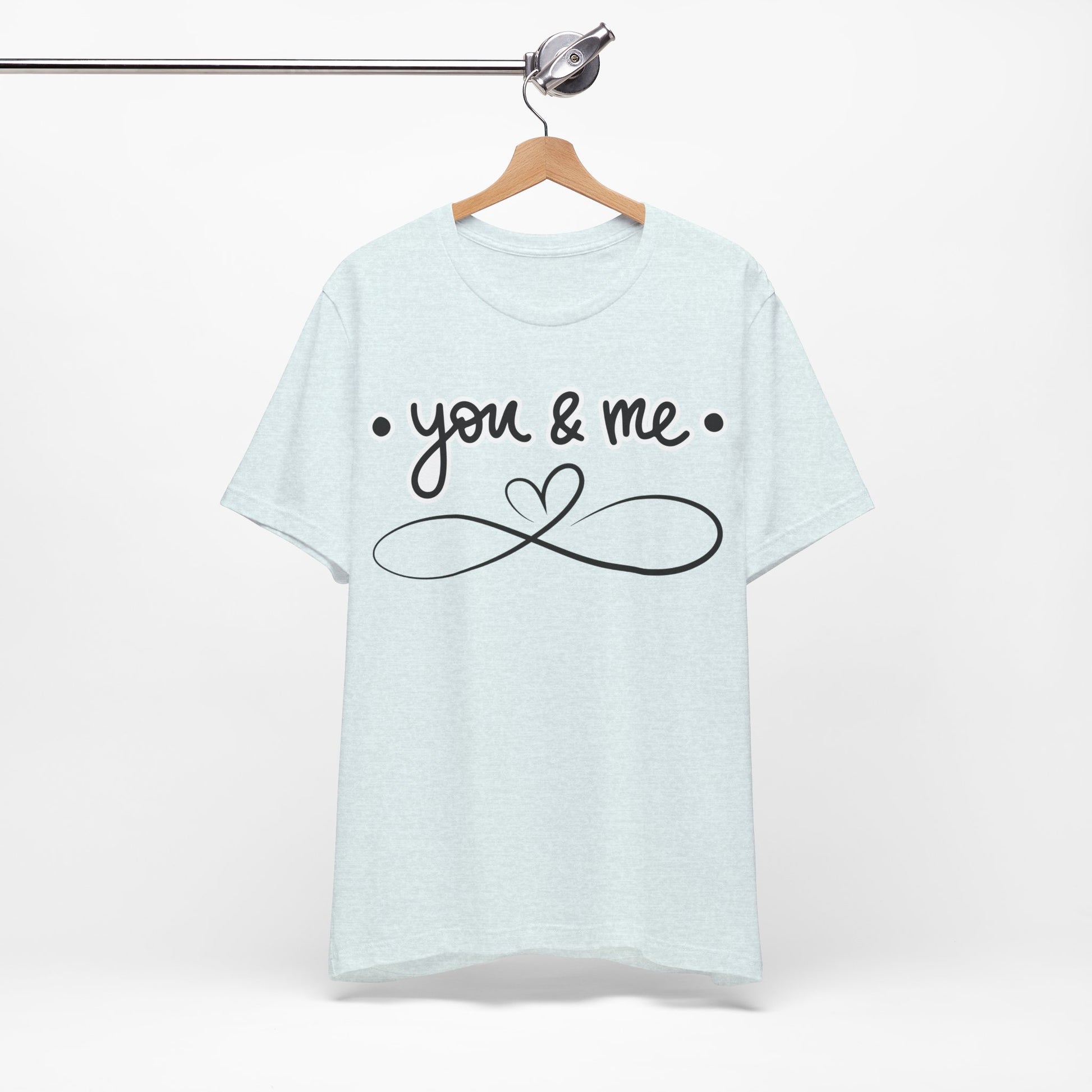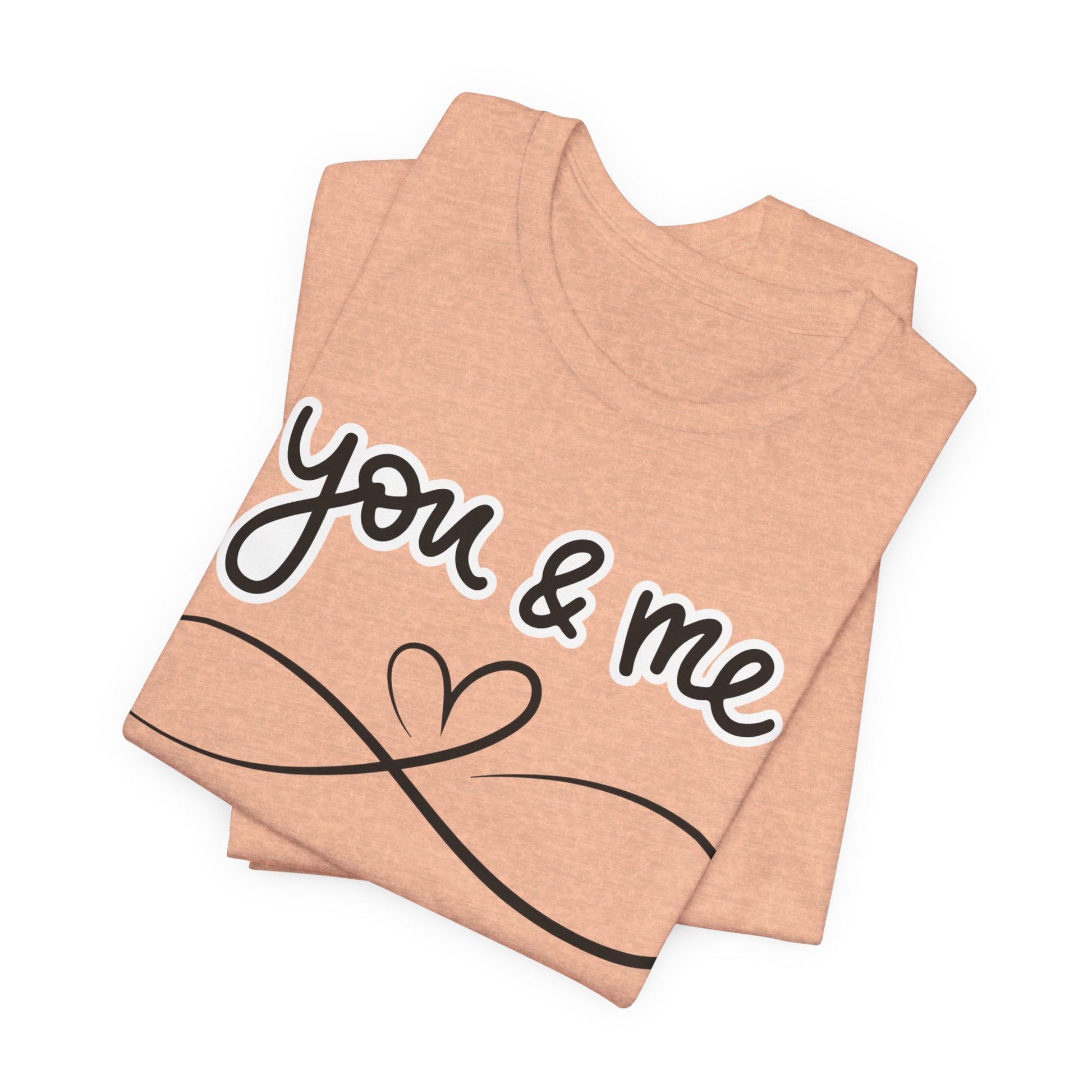 This Unisex Jersey Short Sleeve Tee is the perfect blend of style and comfort for everyday wear. Featuring a minimalist design that reads 'you & me' with an elegant heart, it evokes feelings of love and connection. Ideal for casual outings, this tee enhances any wardrobe, whether you're dressing up for a date night or enjoying a cozy day at home. It's a wonderful gift for couples, friends, or anyone celebrating love, making it suitable for occasions like anniversaries, Valentine's Day, or just to show appreciation for a loved one. With a gender-neutral fit, it caters to all, ensuring everyone can express their affection in comfort and style.