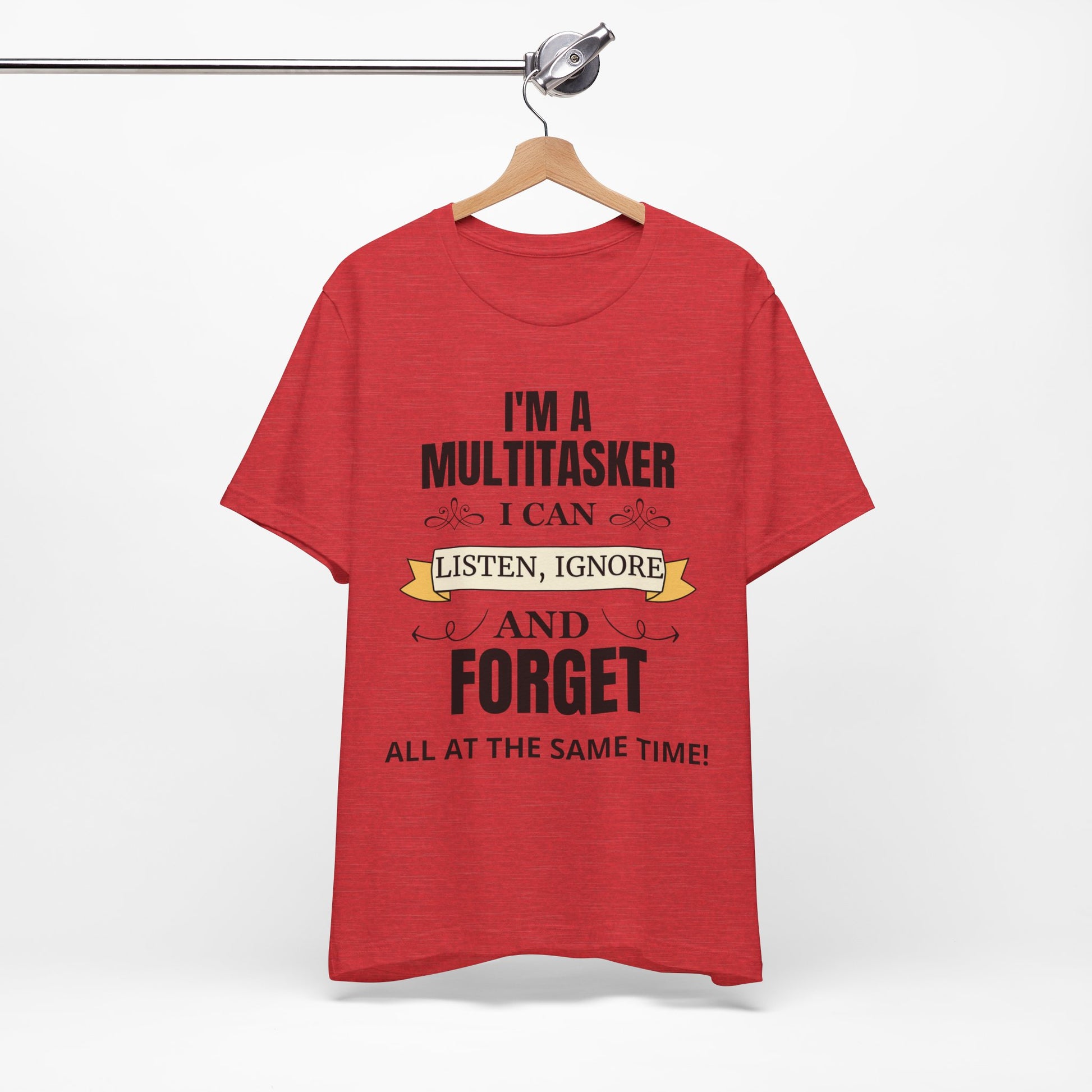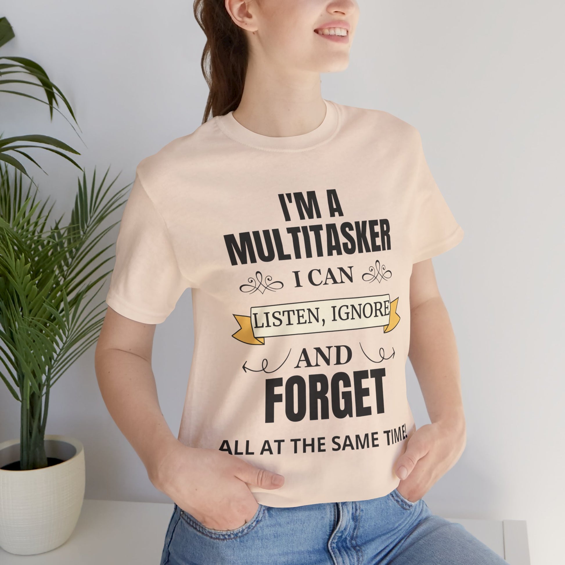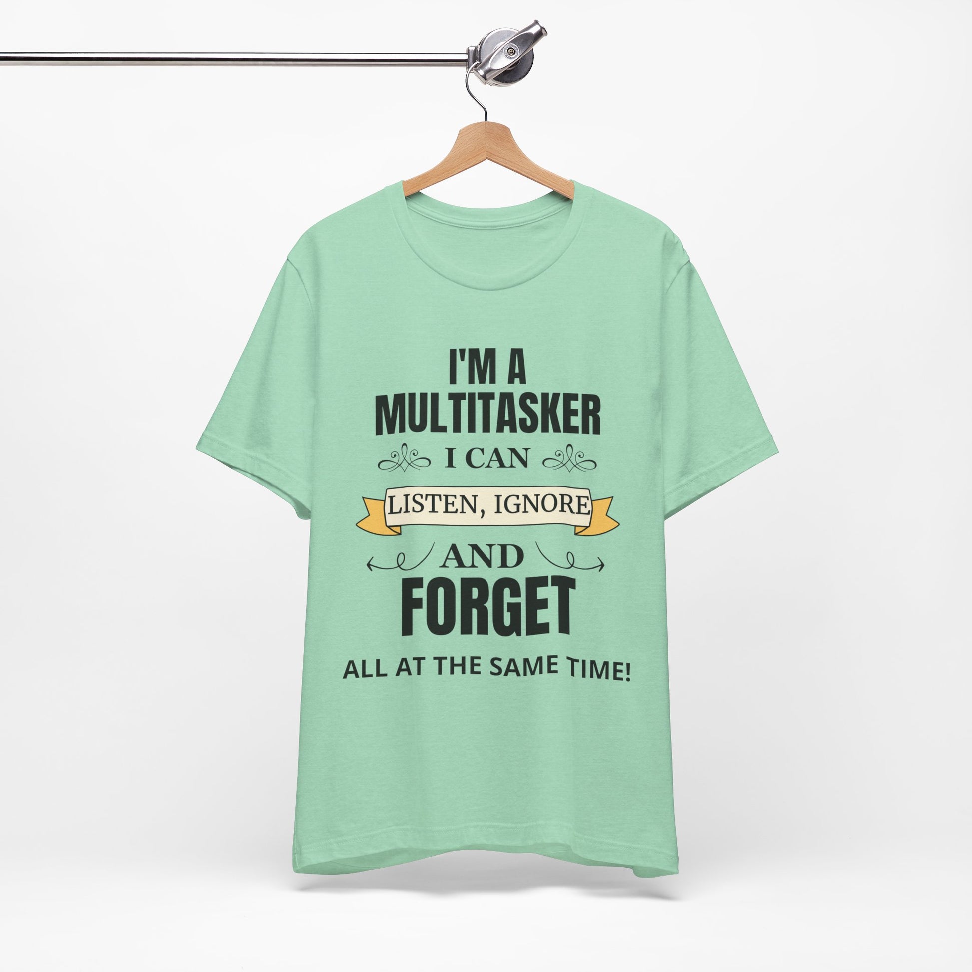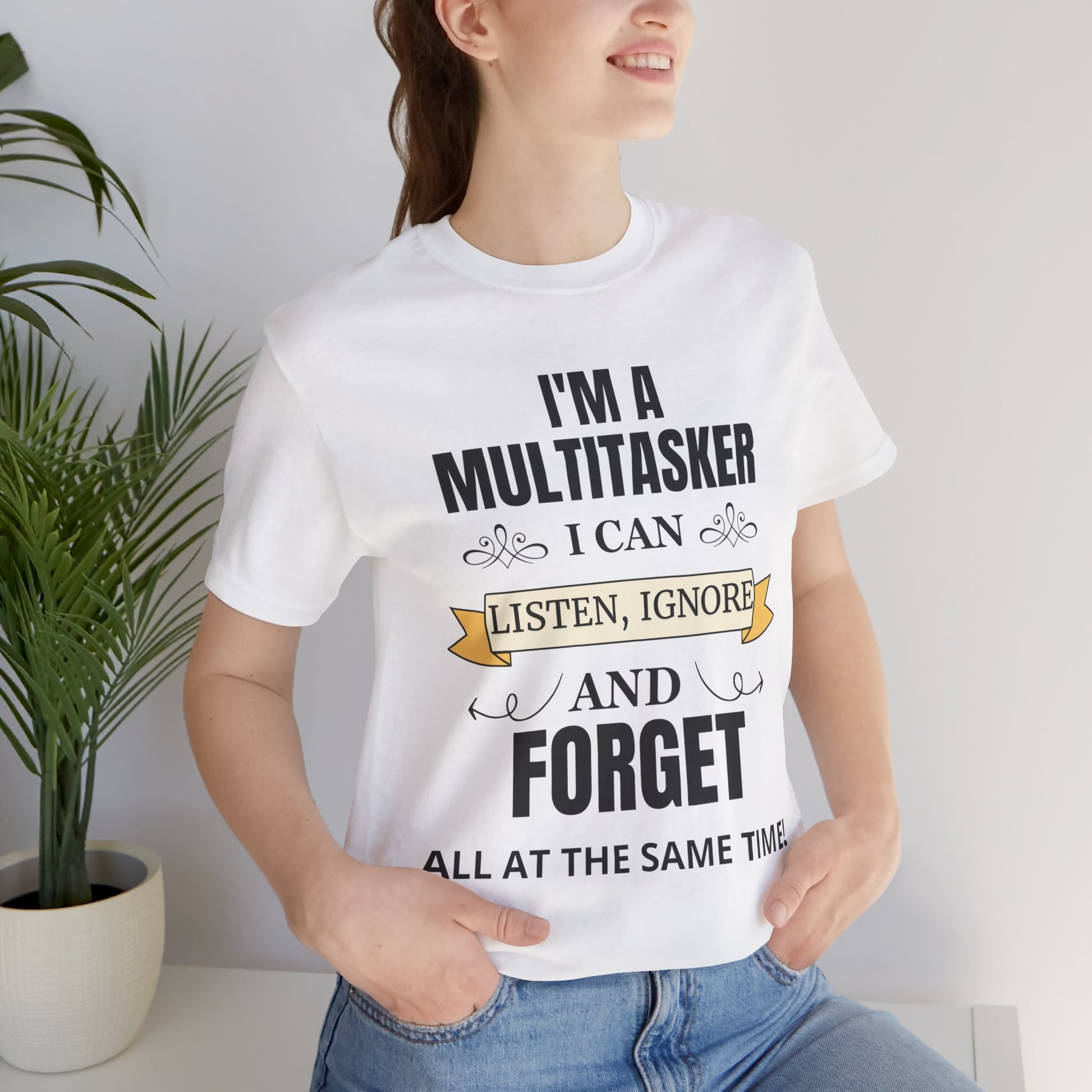Embrace your unique "multitasking" skills with this humorous graphic tee! Perfect for anyone who juggles listening, ignoring, and forgetting all at once. A funny gift for friends, family, or colleagues with a great sense of humor.