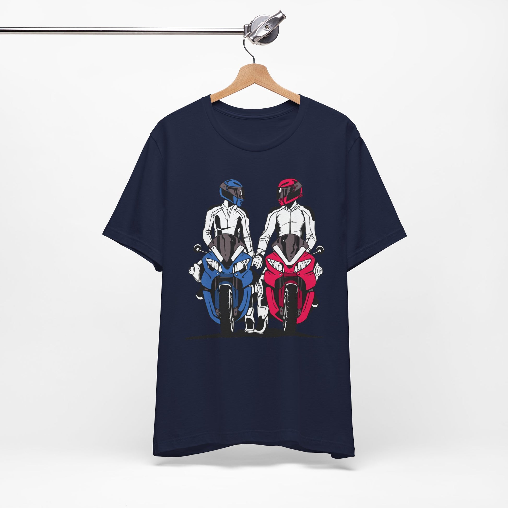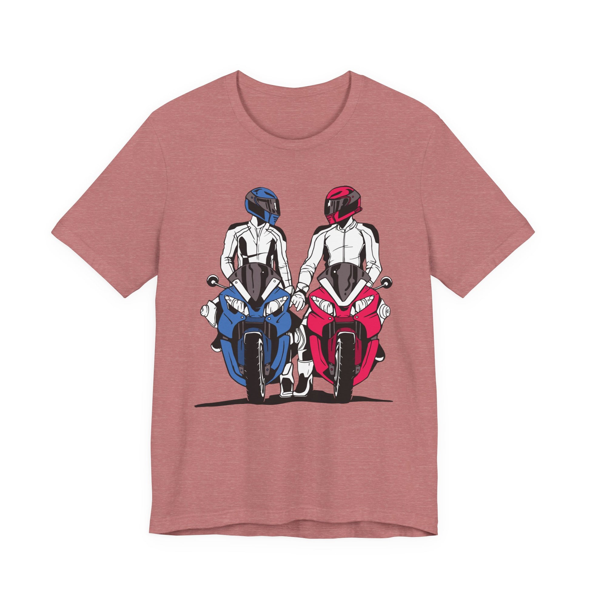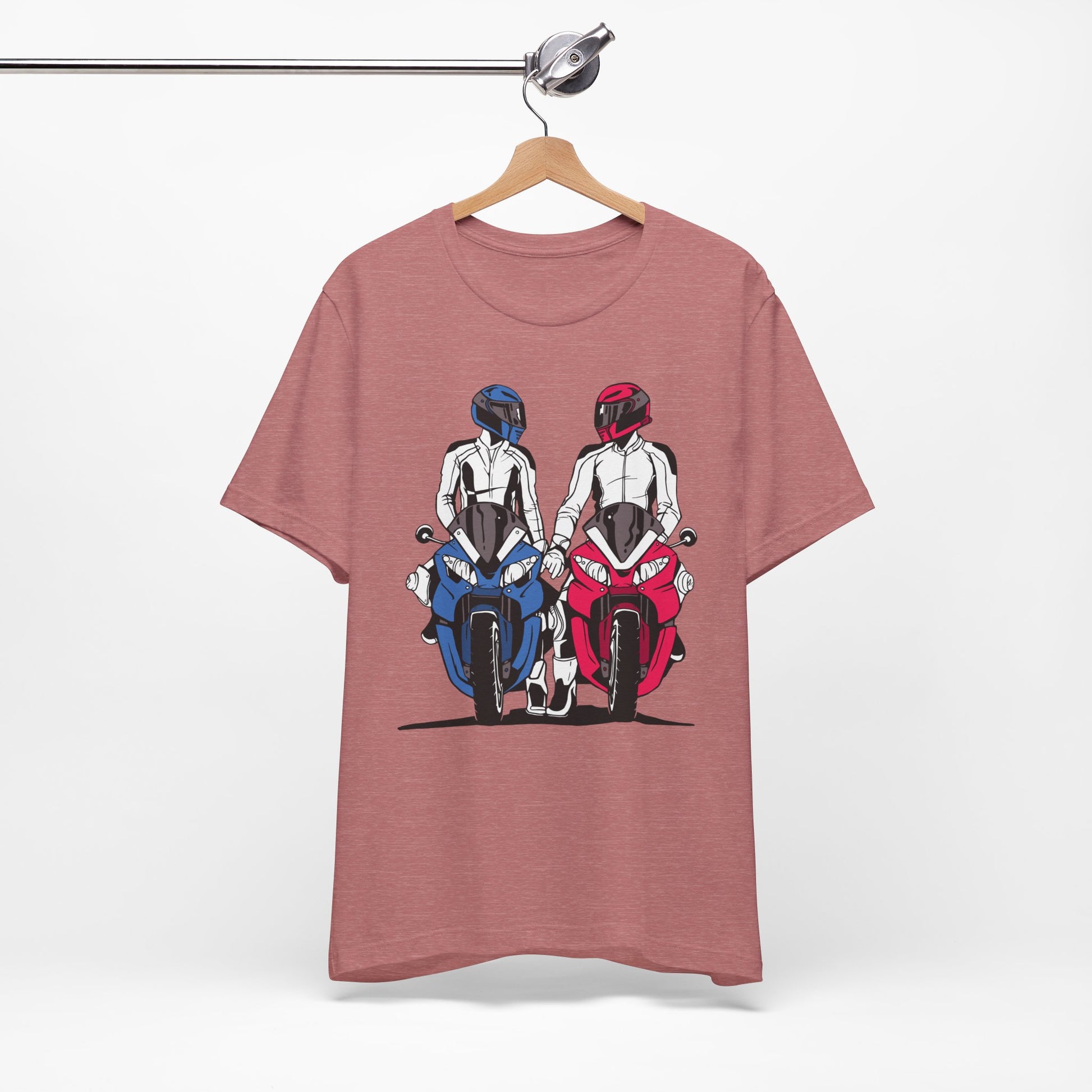 Ignite your passion for the open road and each other with our "Ride Together" biker tee. This striking design features two motorcyclists, in blue and pink, hinting at an unbreakable bond. Don't miss out on this unique statement piece – limited stock is going fast! Perfect for motorcycle enthusiasts and couples who share an adventurous spirit.