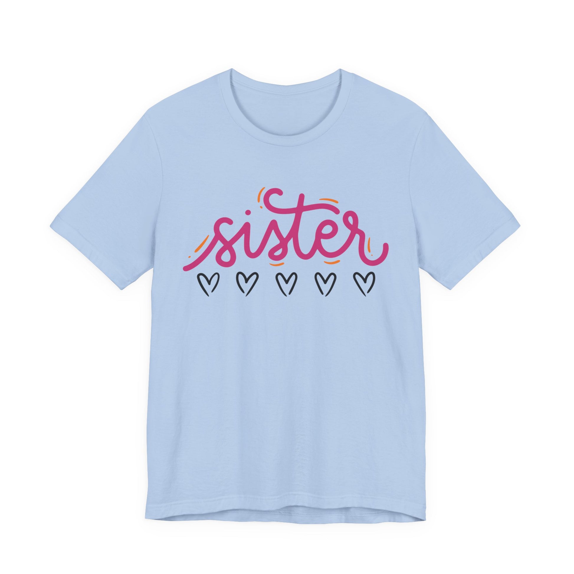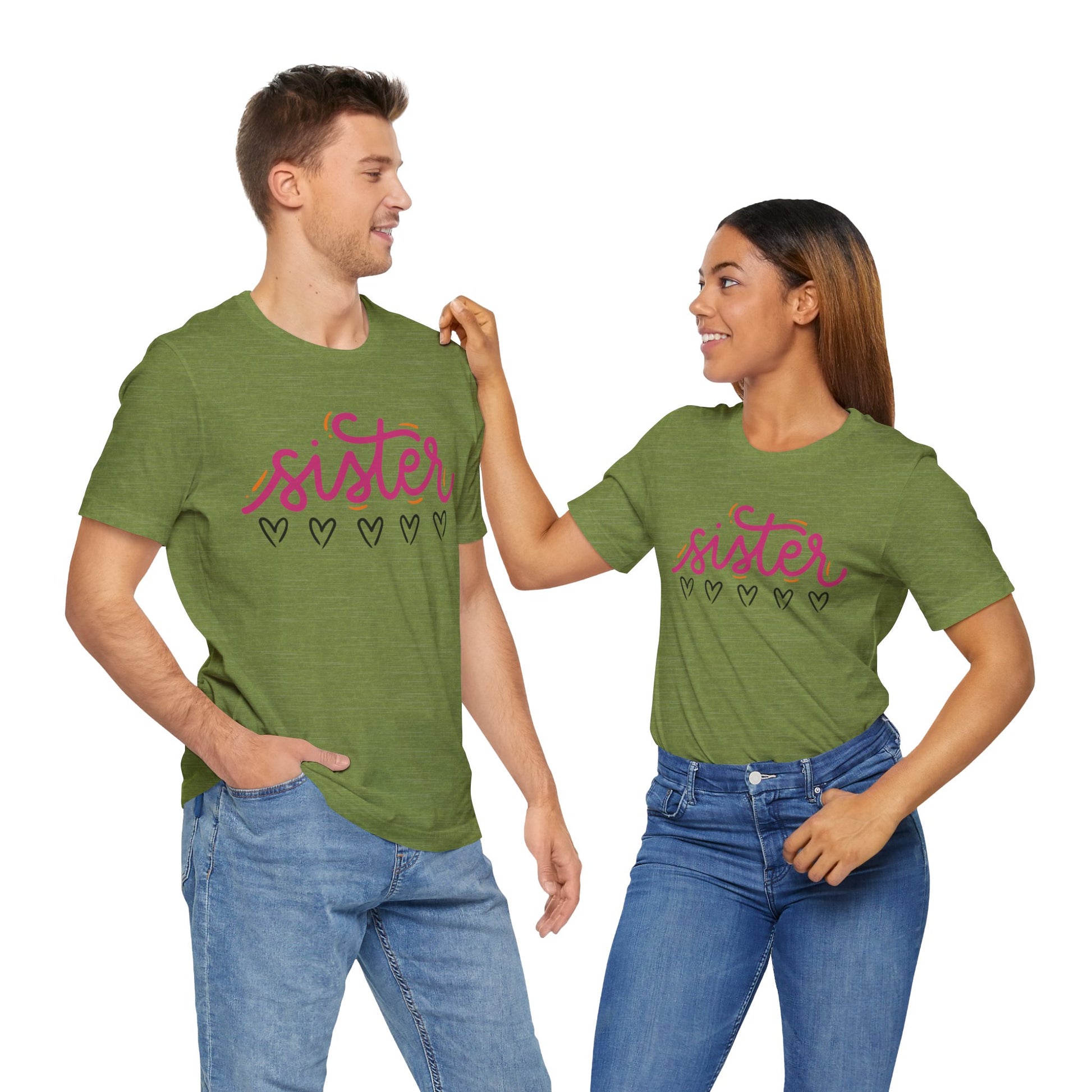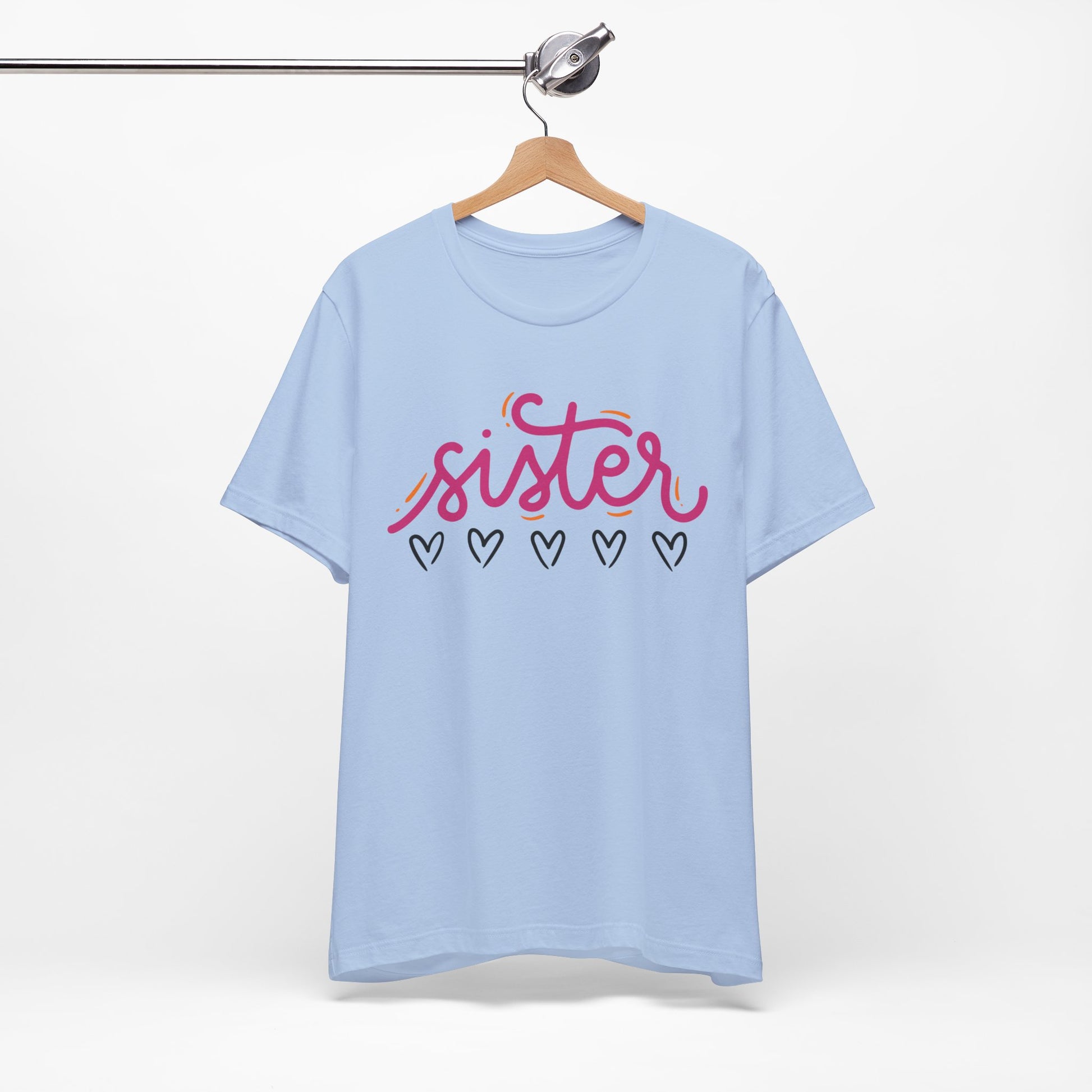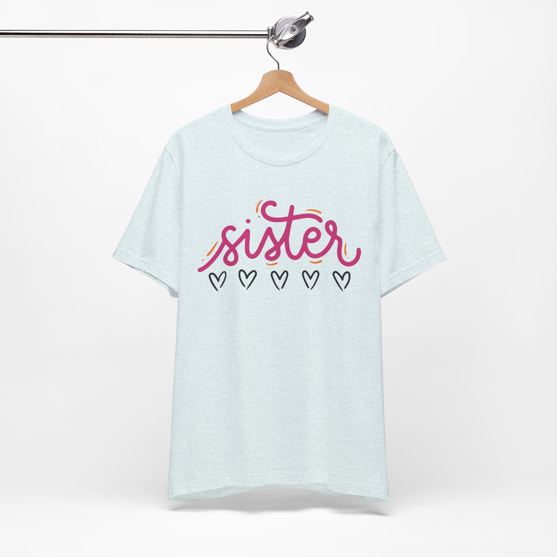 Celebrate your bond with our "Sister" graphic tee, featuring a sweet script font and charming heart accents. Perfect for sisters, best friends, or as a thoughtful gift to show your love and appreciation.