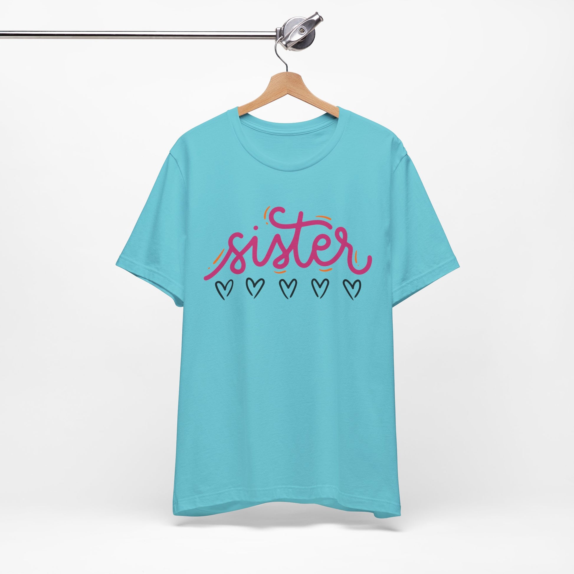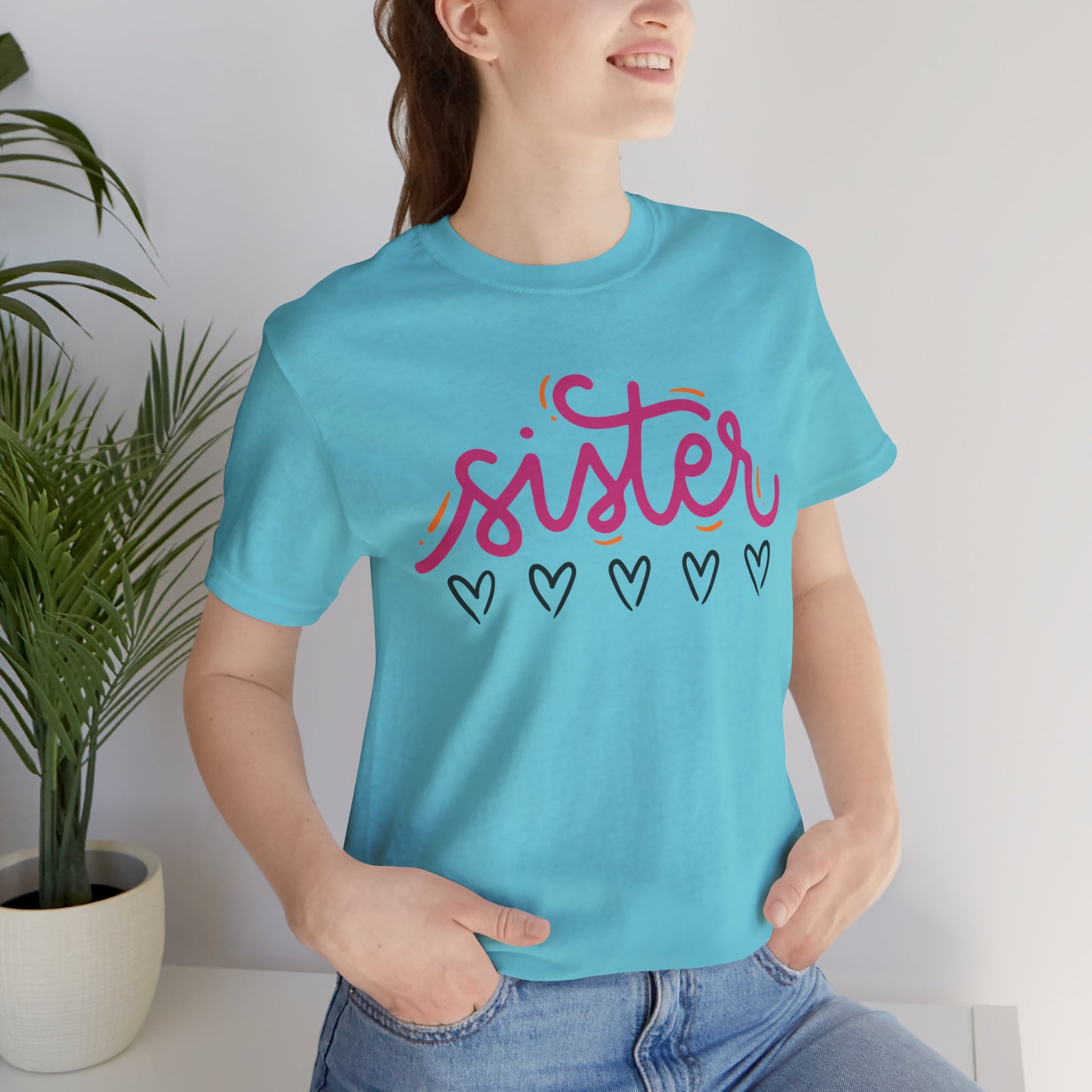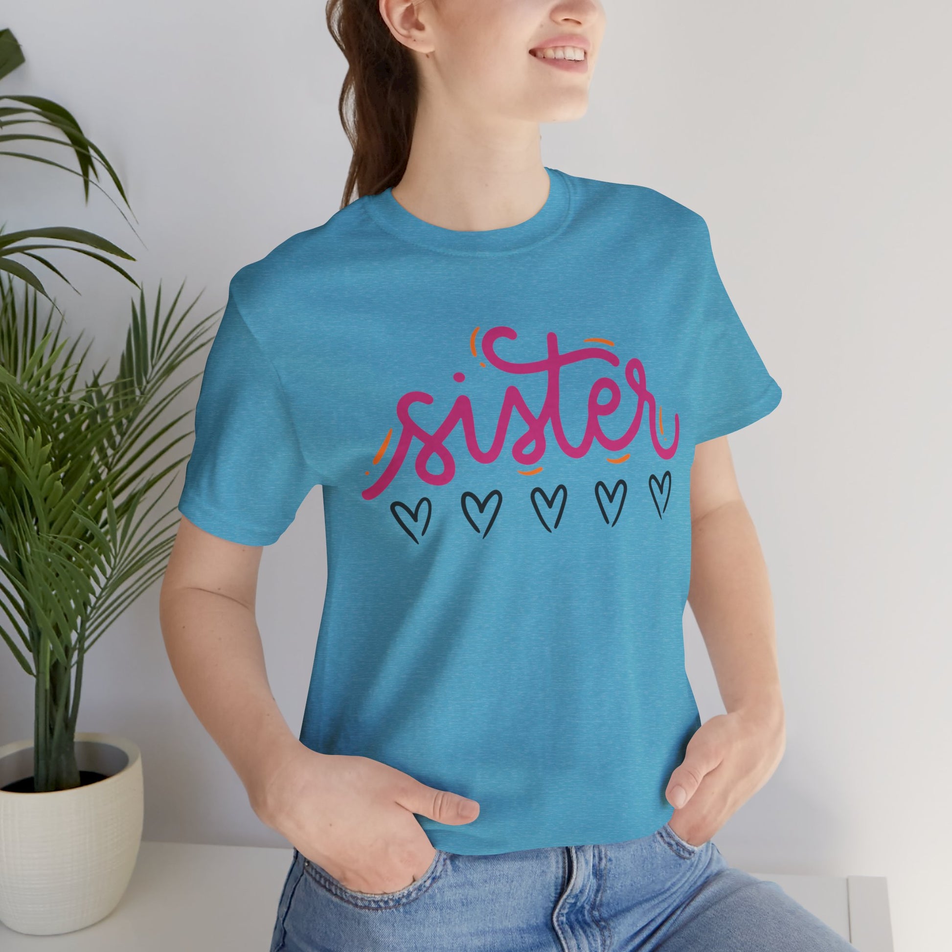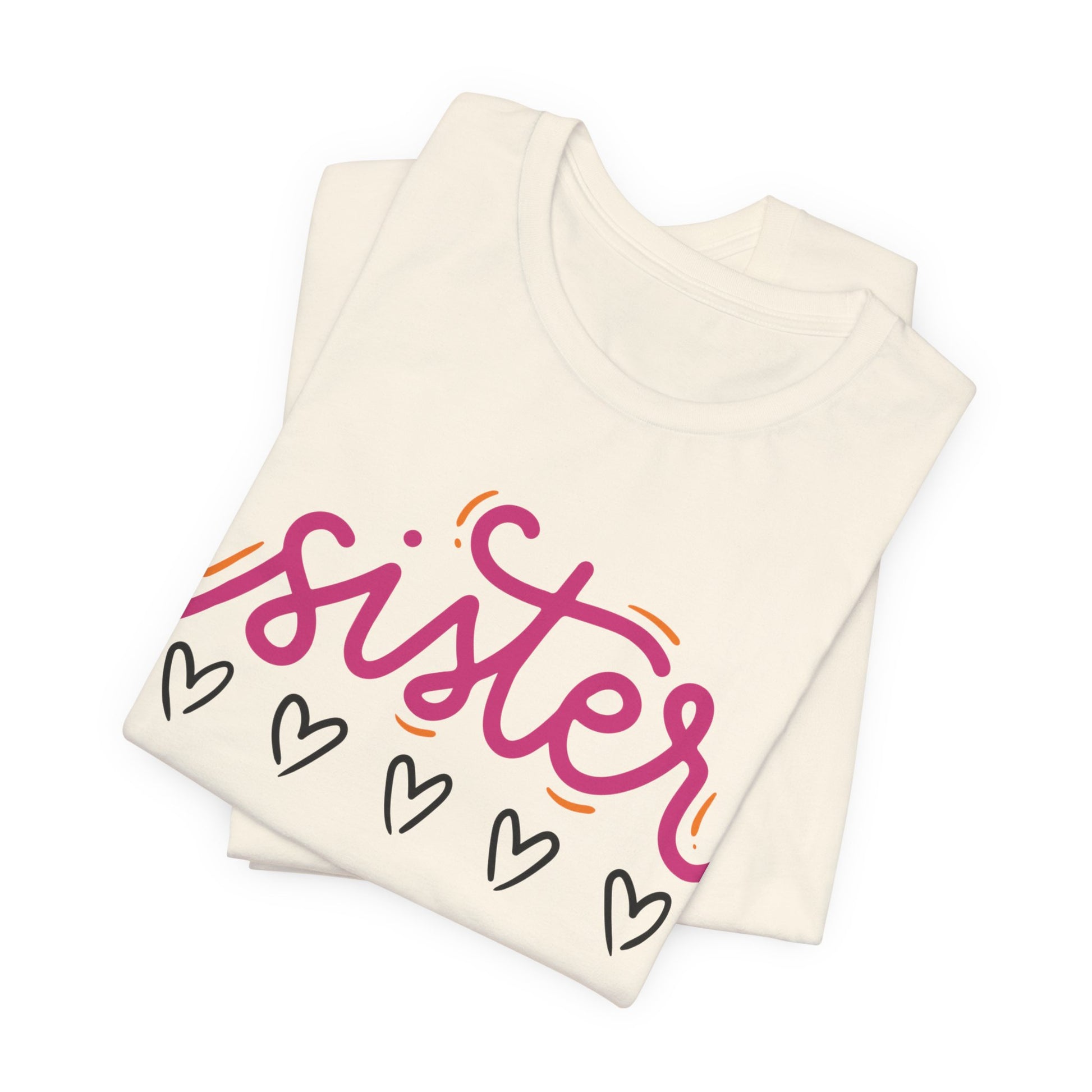 Celebrate your bond with our "Sister" graphic tee, featuring a sweet script font and charming heart accents. Perfect for sisters, best friends, or as a thoughtful gift to show your love and appreciation.