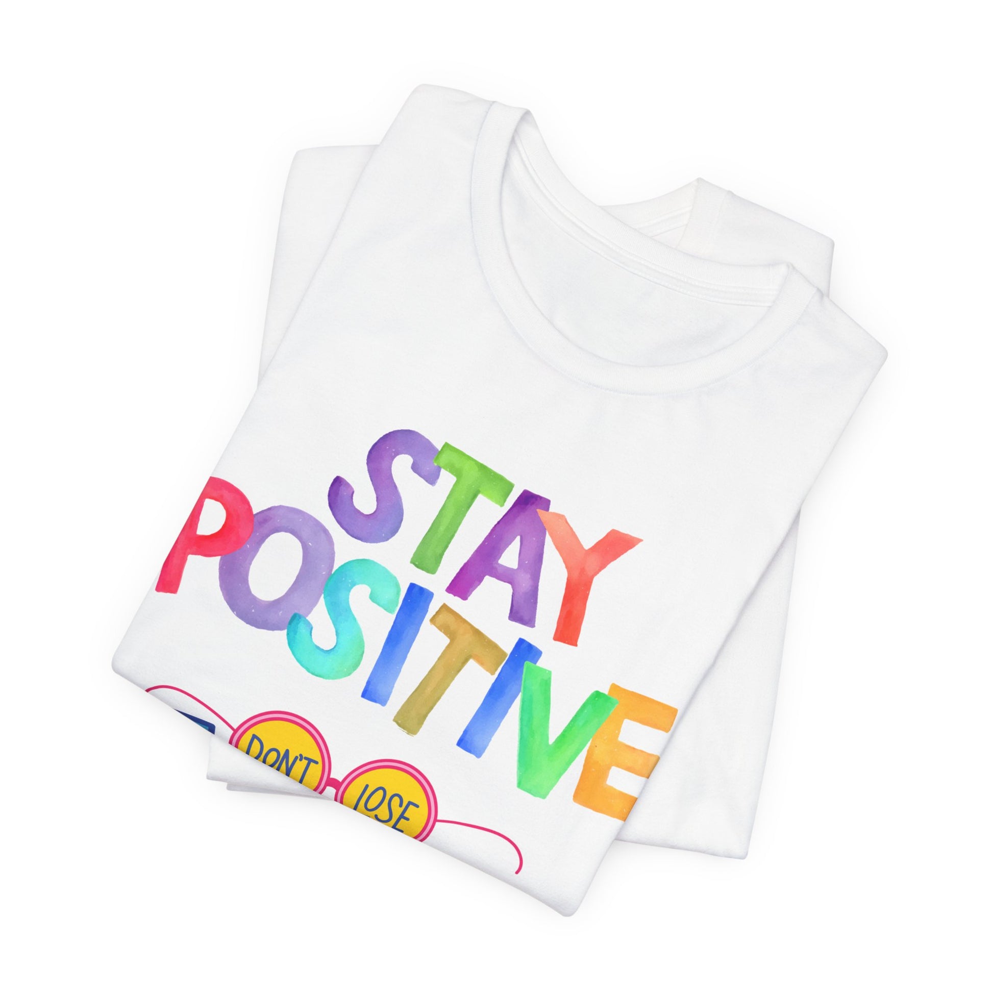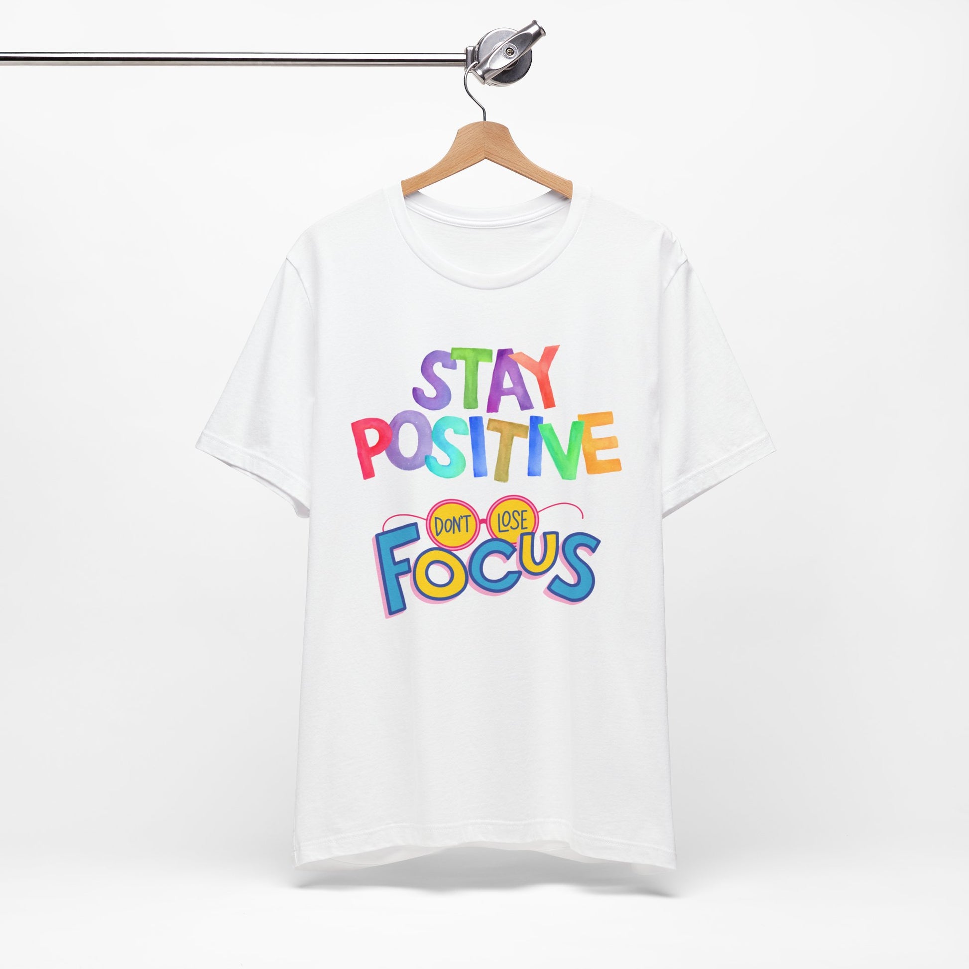 Keep your head up and your goals in sight with this vibrant "Stay Positive, Don't Lose Focus" t-shirt. The playful, colorful font provides an energetic reminder to persevere.