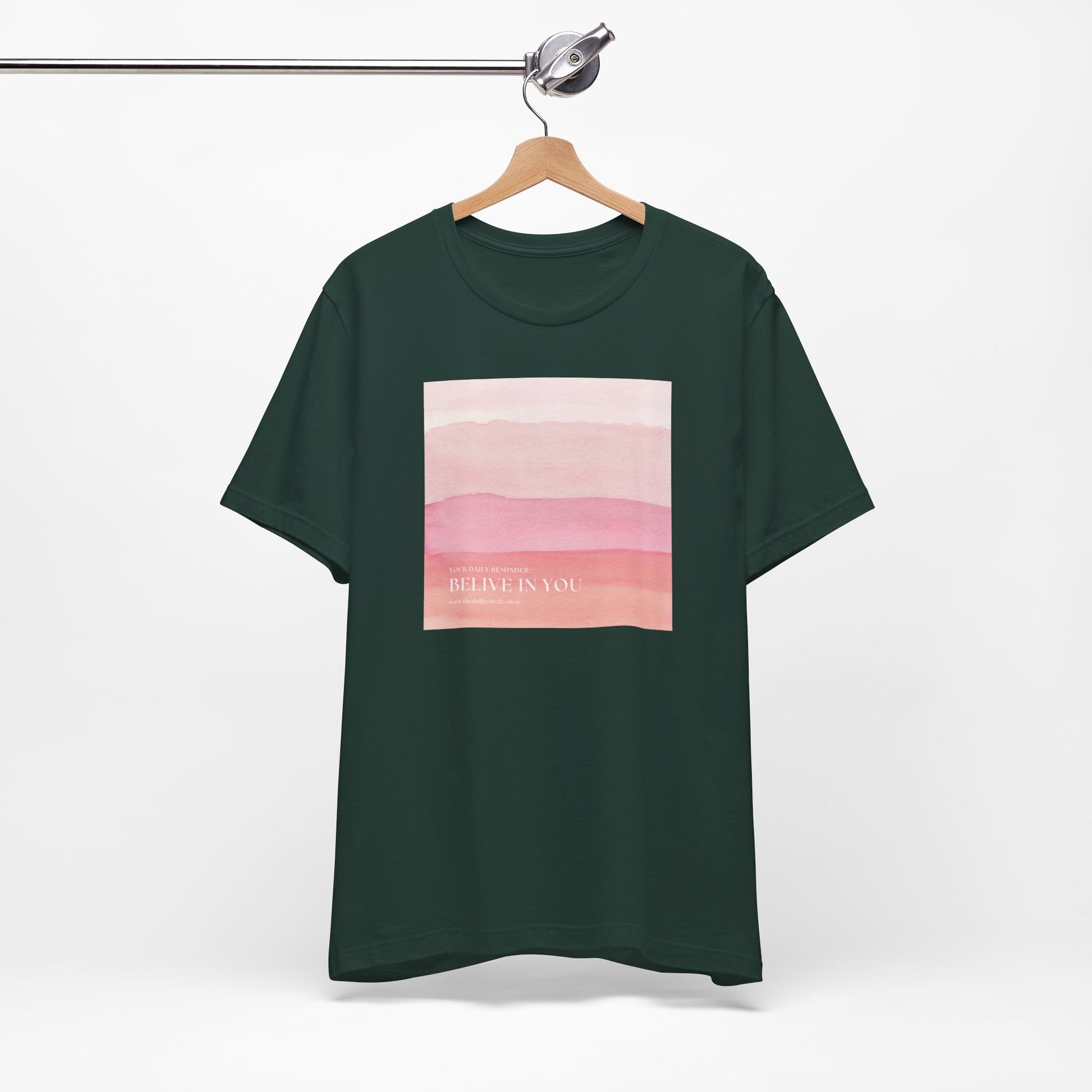 SInspire self-confidence with our "Your Daily Reminder: Believe In You" tee, set against a soft, beautiful watercolor background. This design blends gentle artistry with a powerful message of self-belief, perfect for minimalist and uplifting styles.